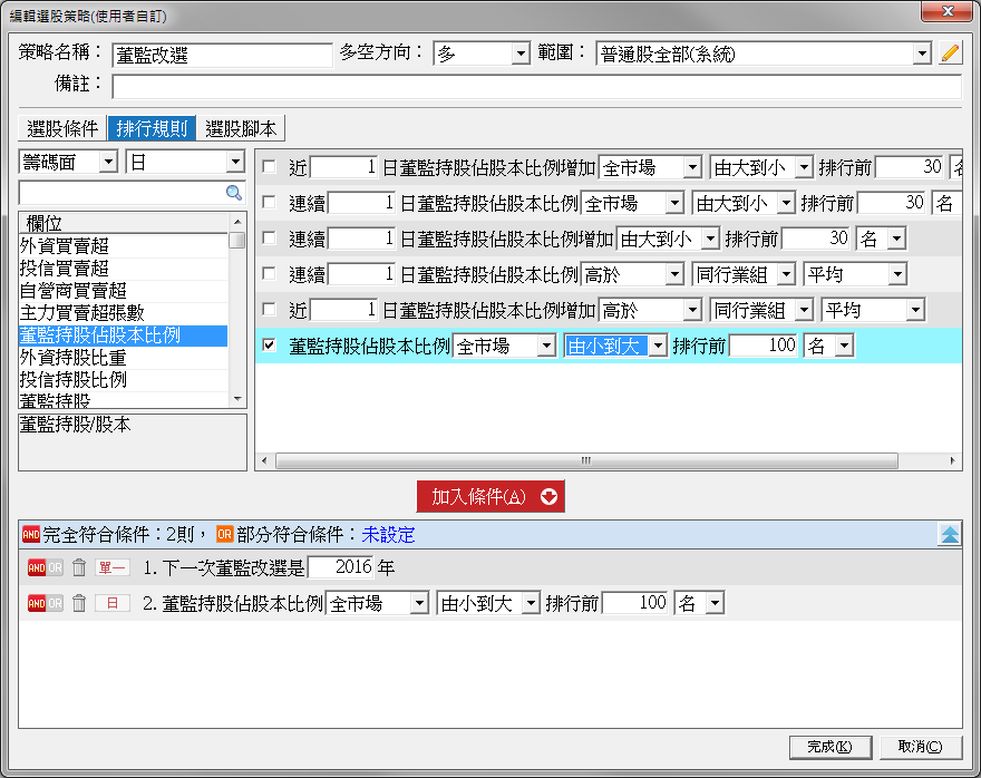第二種條件是排行規則。排行規則是對一群股票的某一個欄位值(可能是價量、或是財報數字)進行排序篩選。可以輕鬆挑選出前段班或後段班的股票。排行規則一樣也是以欄位為基礎。 這邊我們想找出董監持股水位偏低的。所以我們這樣選擇條件: 1. 選擇籌碼面 2. 頻率選擇 3. 再點選董監持股佔股本比例這個欄位。 4. 畫面上右邊最後一個條件是董監持股佔股本比例[全市場][由大到小]排行前[30][名],我們當然是要找董監持股低的,所以把由大到小改成由小到大,名次放寬到前100名。 5. 點擊加入條件(A),把設定好的條件加入已選條件區。 filter25