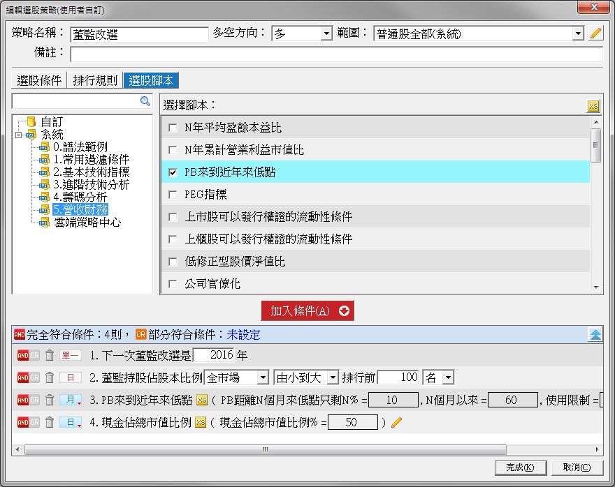 最後一種條件是選股腳本,選股腳本是利用XScript寫成的條件,可以進行比較複雜的運算。並且,使用者也可以自己寫腳本,所以是一項非常強大的功能。 前面我們已經設定了快要董監改選且董監持股低的條件,這邊我們再加二個財務面的條件: 1. 選擇5.營收財務 2. 勾選PB來到近進來低點現金佔總市值比例這二個條件 3. 點擊加入條件(A),把設定好的條件加入已選條件區。(沒錯,一次可以勾選多個條件加入!) filter26