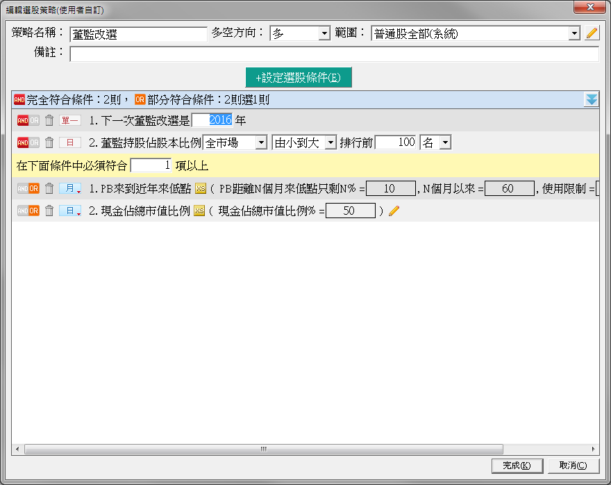 當條件都加入已選條件區後,我們還可以在這裡進行條件的微調。刪除條件或是修改計算的頻率和參數。比較特別的是每個條件還可以設定成完全符合部份符合這二種選項。部份符合就是指這群條件裡面,只需要滿足幾個條件,就幫我們選出來。 比如說我們這次的範例是要找出可能會有董堅改選行情的股票,那「下一次董監改選是2016年」和「董監持股佔股本比例全市場由小到大排行前100名」這二個需要完全符合的必要條件。另外二個「PB來到近年低點」、「現金佔總市值比例」則是我們希望選出便宜標的而增加的條件,只要能符合其中之一即可(當然是愈多愈好),所以我們把這二個條件調整到部份符合條件那邊。 1. 點擊PB來到近年低點前的圖示 2. 點擊現金佔總市值比例前的圖示   filter27按下完成,新增的選股法,就設定好了!!! 透過幾個步驟就可以自己排列組合出專屬的選股法。平時看看網路、書籍、雜誌上的理財達人的選股邏輯,把它設成選股法,加以變化運用,自己也可能成為選股達人喔!