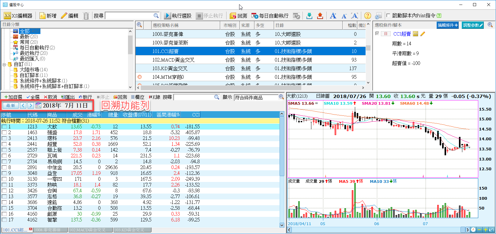 有使用過選股策略的用戶應該不陌生下面的圖示,不過在左下的【選股結果報表】上方新增了「回溯功能列」,這功能列可以讓大家輕鬆的去指定過往某個日期並呈現該日期的選股結果唷!讓我們隨著底下說明一步一步的來操作吧!