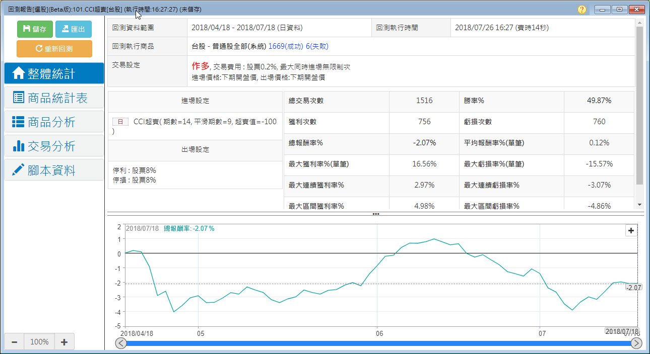 在這個介面,用戶們可以依照自己需求來調整參數,當設定完成後,就可以點擊介面右下角的【開始回測】按鈕,系統就會開始執行回測功能!