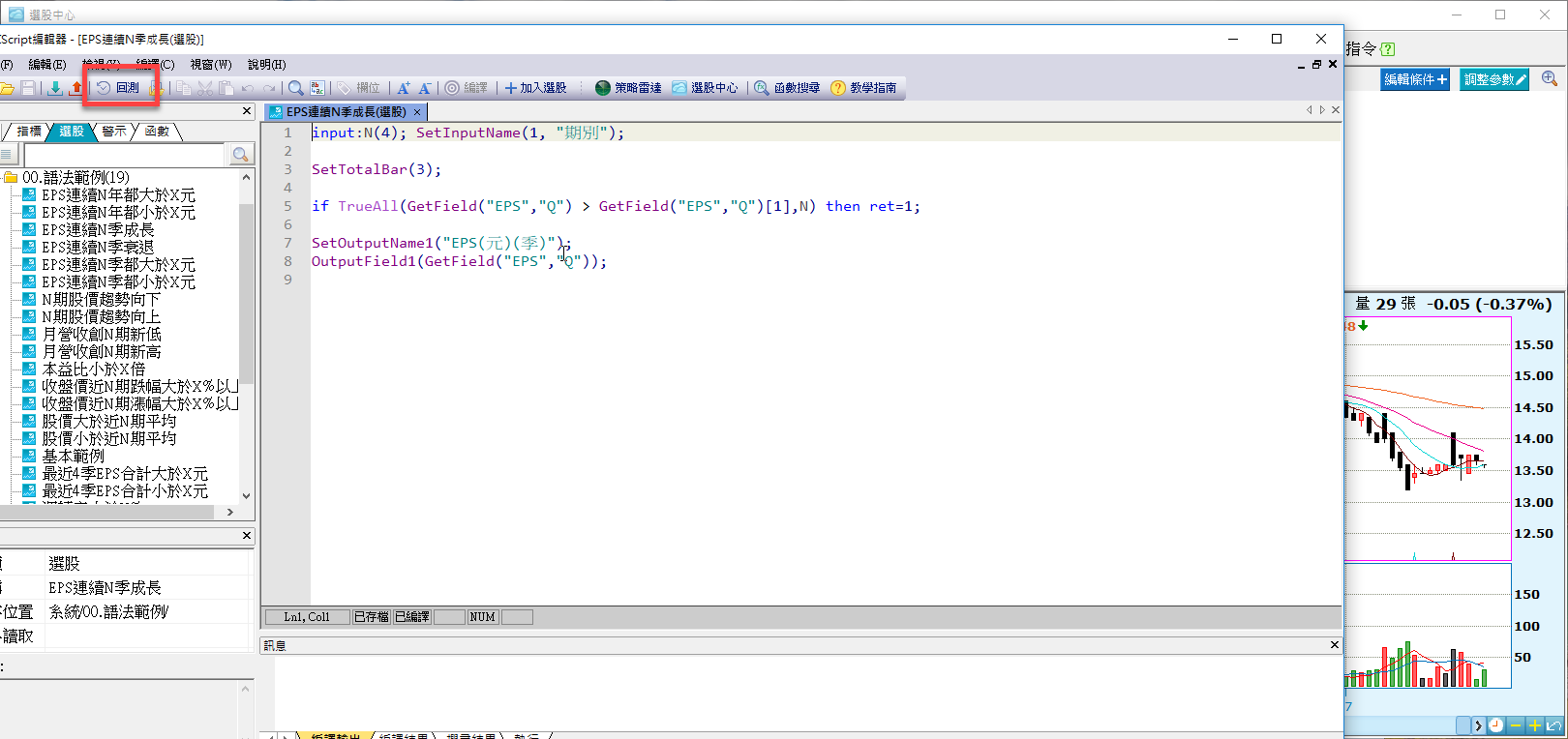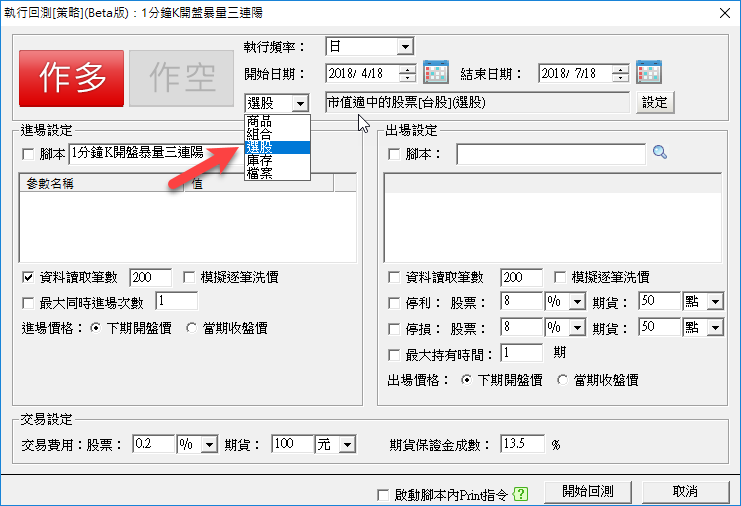 • 在【XScript編輯器】中,開啟要執行回測的選股腳本,然後點擊上方工具列的「回測」按鈕,系統就會叫出該選股腳本的「執行回測設定」介面