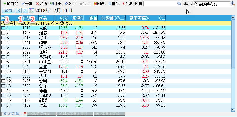 選股結果列表中,有幾個基本會出現欄位,分別為「成交」、「漲幅%」、「總量」,這幾個欄位一定會顯示目前系統最新轉檔的資料,所以為了讓各位用戶在回溯過去日期時,可以清楚知道該日期的收盤價格,所以回溯時列表會出現「收盤價(回溯日期)」&「區間漲幅%」這兩個欄位。 舉例來說,上面的示意圖是回溯到2018/7/11日,而當下「1213大飲」最新轉檔的成交價為「13.65」,7/11的收盤價是「13.55」,所以簡單的「區間漲幅%」是 (13.65 - 13.55)/13.55 = 0.74