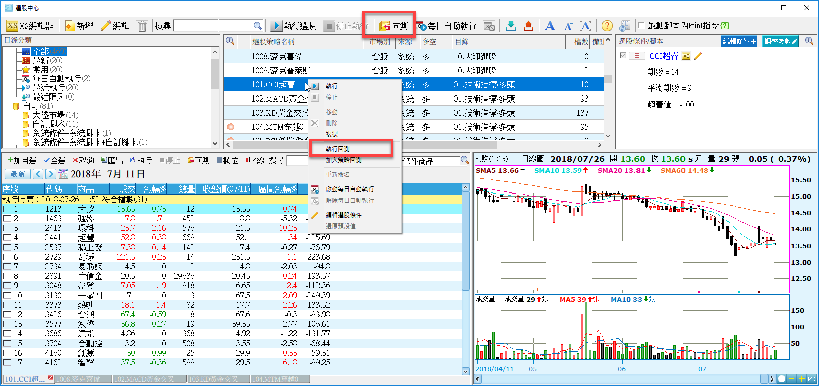 • 【選股中心】中,可以利用「選股策略」右鍵選單的「執行回測」選項,或是上方工具列的「回測」按鈕來叫出這個選股策略的「執行回測設定」介面