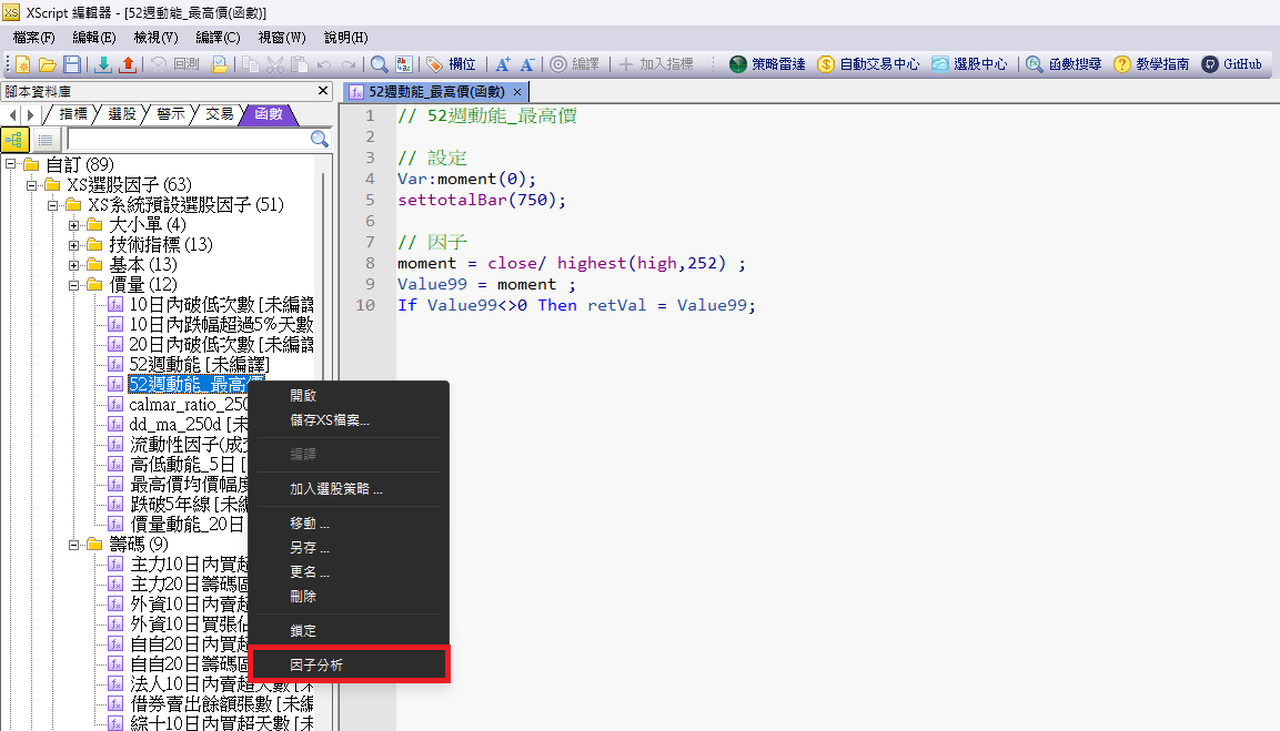 完成函數腳本編譯後,可在 XScript 中以下列三種方式開啟因子分析設定:
