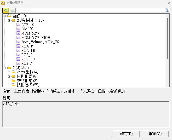 • 進場腳本 此處顯示的是要作為因子的函數腳本,點擊右側放大鏡會調出函數目錄視窗。