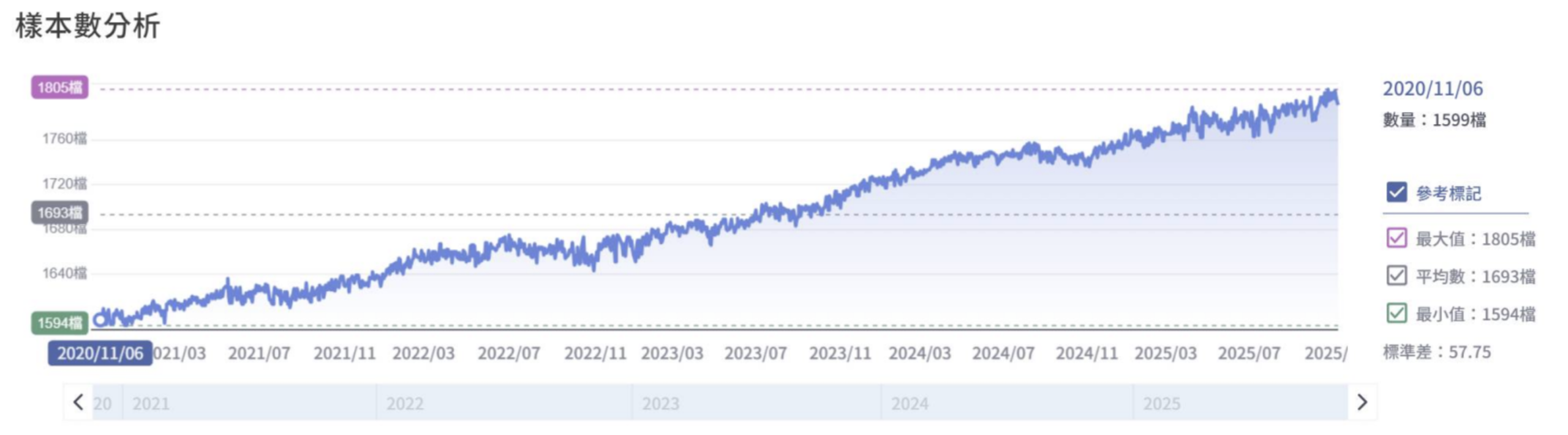 • 數據完整性 「樣本數分析圖」追蹤每日的有效股票數量,確保回測結果並非建立在極少數樣本上,以此觀察數據的代表性與回測的穩健性。