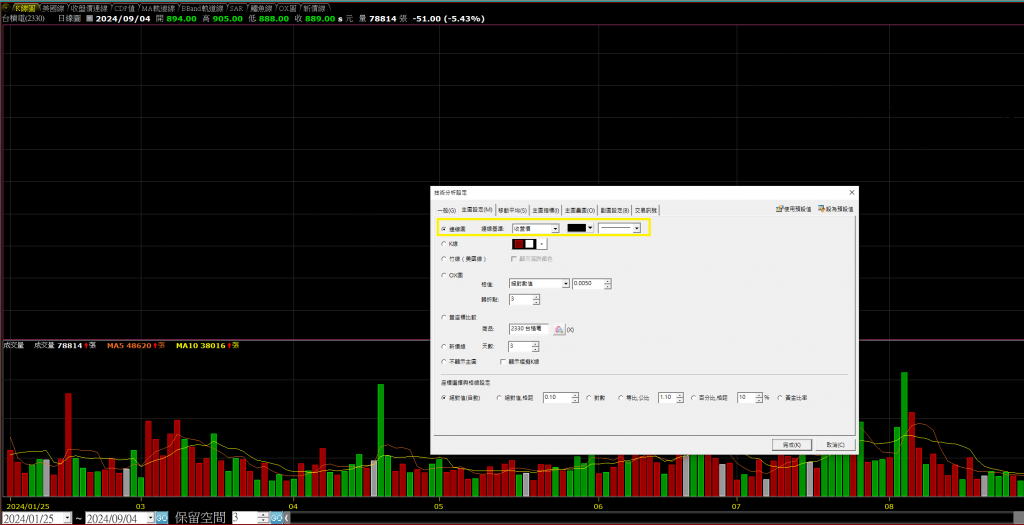 K 棒柱體和外框的顏色可以在繪圖設定中作修改,如下圖。 若希望將畫出的 K 線取代原有的主圖,可以在技術線圖設定中將主圖的 K 線改為連線圖,並將連線的顏色設定成和背景顏色相同。 這樣只要將所需的 XS 指標設定為主圖疊圖,就可以達到近似的效果。