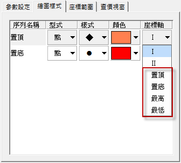 由於主要是介紹繪圖功能,小編盡量用較簡單的腳本當作範例,其餘的就請各位自行發揮使用啦。   將指標疊加到主圖上後,畫面預設會是線條的圖型, 同樣至XS編輯器左邊的公式面板中,找到腳本,點擊右鍵開啟選單,選擇繪圖設定開啟繪圖設定視窗。 繪圖設定首先把樣式變更為點,每個點其實就是一個預設的圖示, 我們把進場樣式設成,把出場樣式設定成 ;顏色也同時調成橘色和紅色。 繪圖樣式1到這邊之前的操作方式都與前一篇相同,接下來小編要開始講解不同之處   在上一篇文章中,訊號需要乘上一定的數字,才有辦法在K棒的上下方顯示, 但新版2.30的XQ新增了4個功能,分別是「置頂、置底、最高、最低」,這4個方法只有支援「點」的繪圖模式, 在繪圖設定選擇「點」後,在座標軸設定會多「置頂、置底、最高、最低」的選項。 繪圖樣式2  小編依序來介紹這4個功能的使用方法,都會以主圖做示範