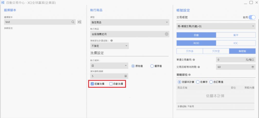 在新增的自動洗價的選項後,策略會有 4 種運作方式,以下會分別作說明。   逐筆洗價和自動洗價皆不勾選 在這種情況下,策略的運作方式會和原本的非逐筆洗價相同。 只有在執行商品 K 棒結束後的第一次洗價,策略才會去運算已結束的那根 K 棒。   只勾選逐筆洗價 在這種情況下,策略的運作方式會和原本的逐筆洗價相同。 策略會在每次商品洗價時運算,每次運算間隔最短會相隔 0.125 秒。   只勾選自動洗價 在這種情況下,策略會在設定的間隔秒數後自動洗價運算。 不會受到商品本身是否發生成交 Tick,或是 K 棒是否結束而影響。 為了確保每根 K 棒運算結果正常,換 Bar 後的第一次自動洗價會重洗已結束 K 棒,此次洗價不會觸發警示或交易。   逐筆洗價和自動洗價皆勾選 這模式是結合「逐筆洗價」和「自動洗價」的功能。 在這種情況底下,策略除了在執行商品有新成交 Tick 進來的時候運算 (逐筆洗價規則),若在自動洗價設定的間隔秒數間都沒有 Tick 進來時,策略也會自動洗價並運算。   需要注意的事項: