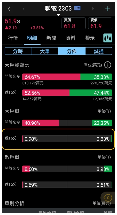 一、透過成交明細中的「大戶買賣比」和「單別分析」找到對的商品