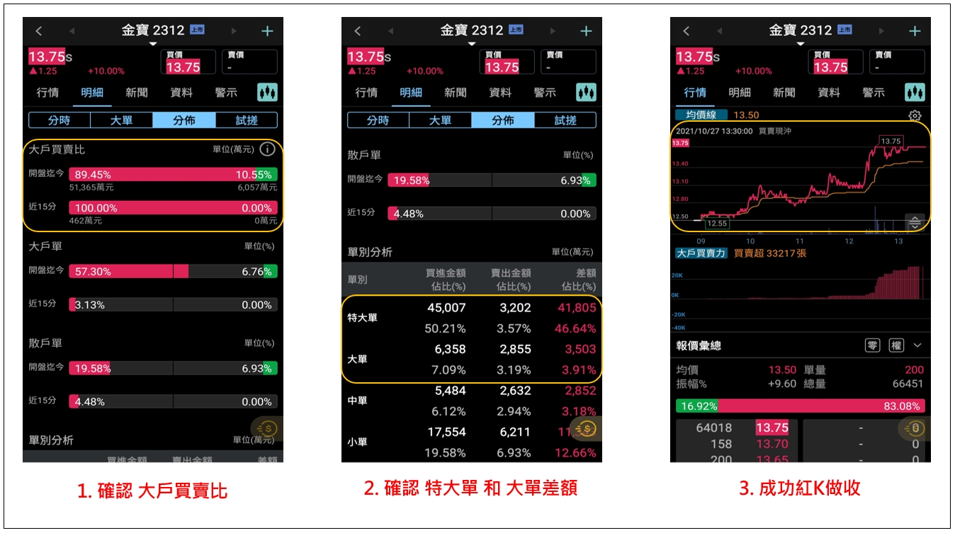 相信大家都能認同「有主力在買的商品比較容易漲」對吧?! 所以我們只要確認這檔商品…   ● 主力成交量一定水準 或 成交量相對過去較高 ● 主力買賣方向一致   那麼我們就可以判定交易這檔商品要賺到錢的機率相對較高,實務上我們只要觀察「分佈」頁面就能完成確認的動作囉 ~   ① 大戶買賣比:這個指標可以告訴我們今天主力進行買進或賣出的力道,同時也也意味著今天主力 多空方向是否一致。   ② 單別分析:這個指標反應出今天整體的成交分布,我們可以關注「特大單」以及「大單」的買賣 差額占比,如果買賣雙方的差額占比相當懸殊,那也代表主力多空方向基本一致。   我們以今天的金寶為例: 大戶買賣比分別為 買進 89.45% 和 賣出10.55%;特大單與大單的買賣差額分別為 46.64 %和 3.91%   從大戶買賣比 和 特大單的買賣差額來看,今天的金寶做多賺錢的機率會高於做空不少,果不其然最終成功以紅K做收 ?