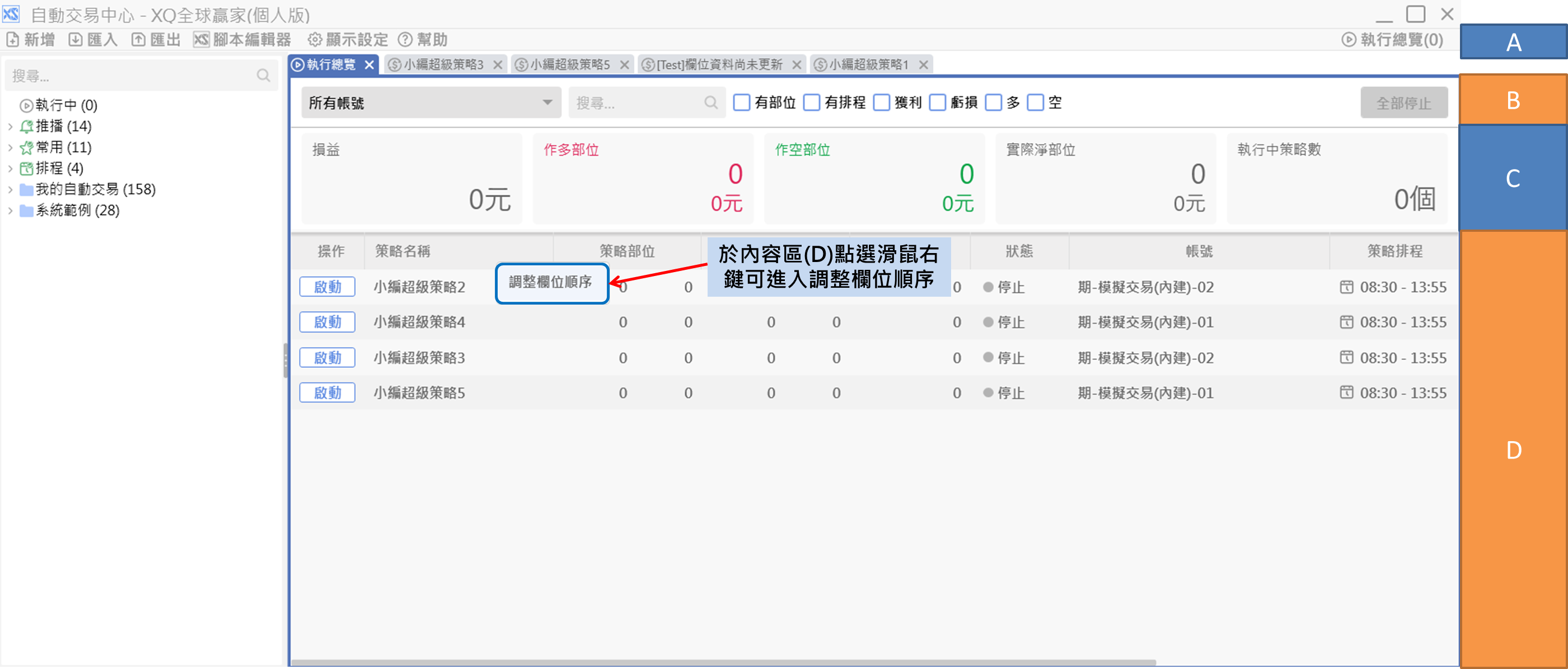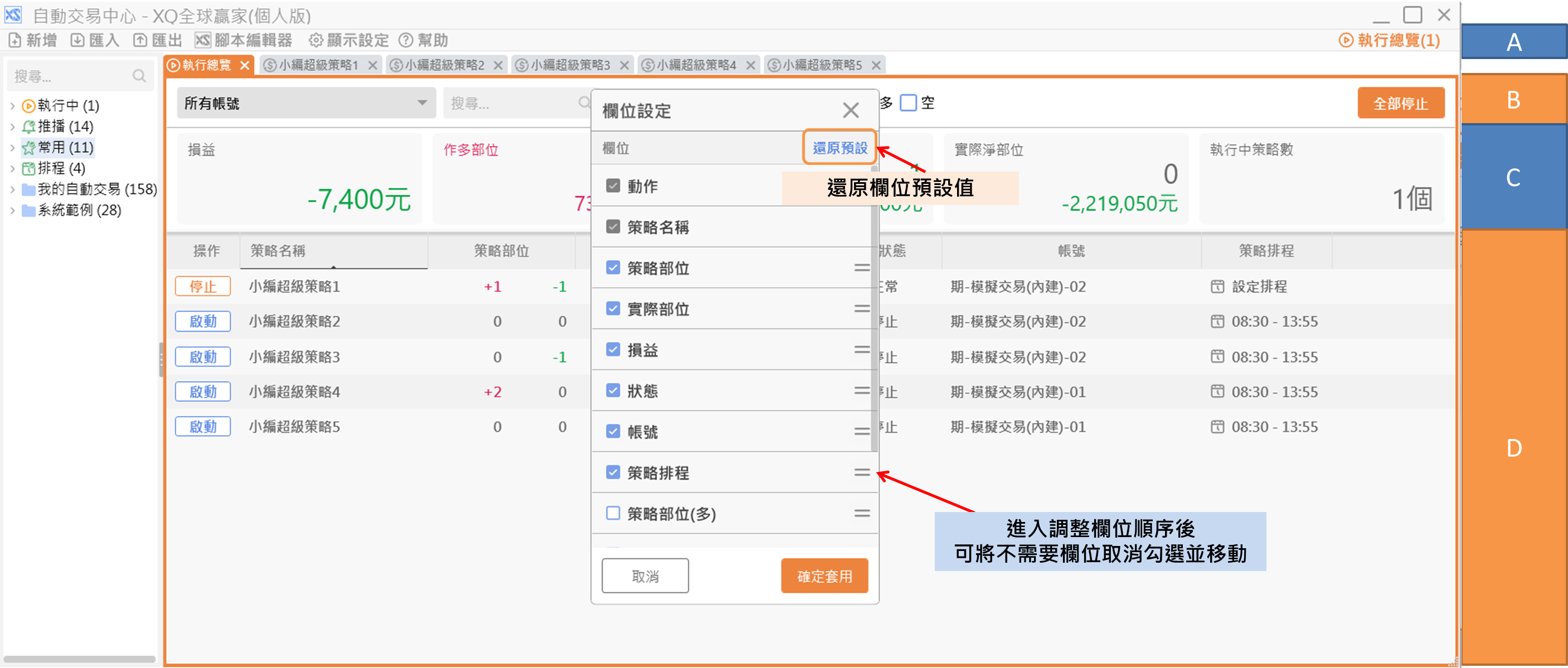 • 目前提供共12個欄位包含:操作、策略名稱、策略部位、實際部位、損益、狀態、帳號、策略排程、策略部位(多)、策略部位(空)、實際部位(多)、實際部位(空),預設值會將「動作及策略名稱」強制開啟,其餘欄位可按照大家的需求來調整順序
