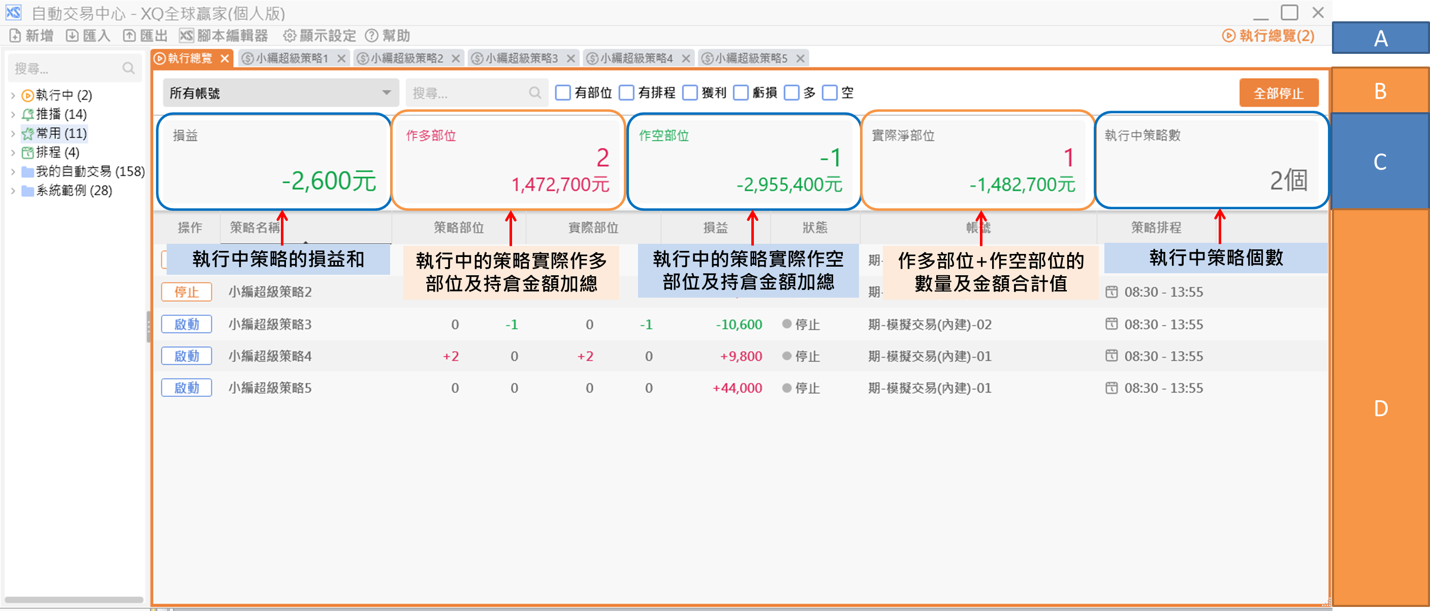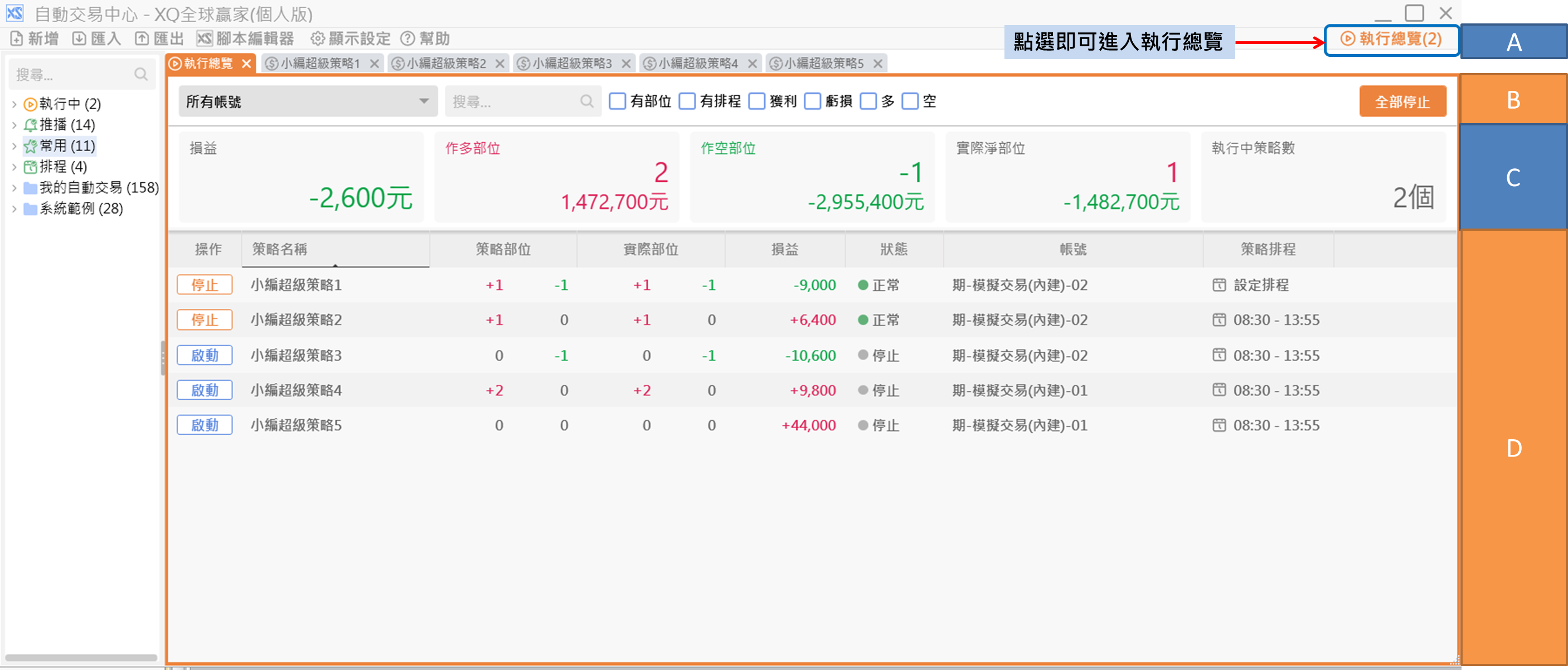 點擊執行總覽後會開啟執行總覽頁,後面的數值為目前執行中策略的個數,以下圖為例,目前執行中的策略為2個。