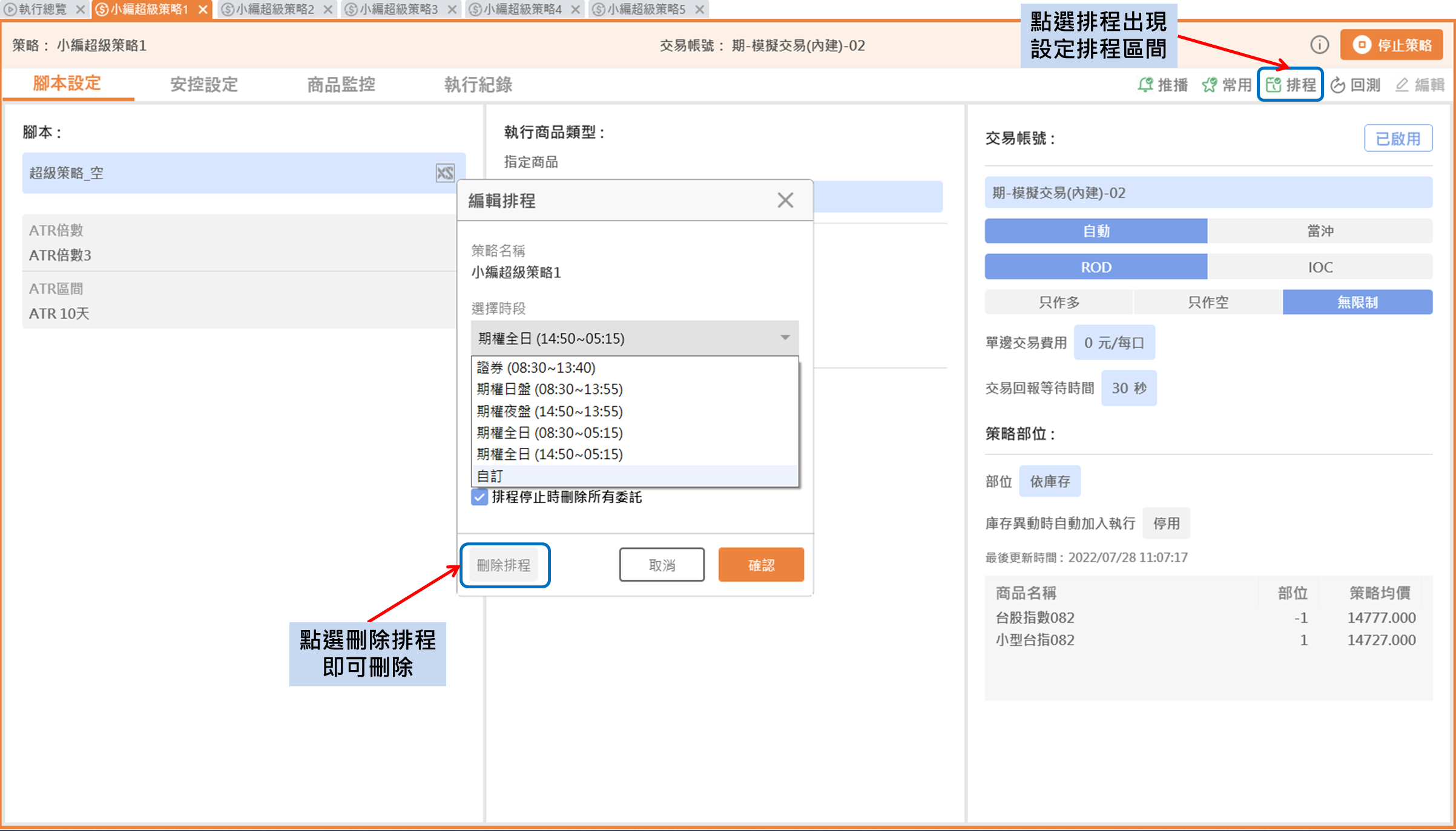 為了讓策略能夠在指定的策略自動啟動與停止,我們可以在每個策略的右上角「排程」中設定策略啟動與停止的區間。若要刪除排程,也是點選「排程」,內有刪除排程的按鈕。 注意事項:需保持XQ與電腦開啟,此功能才能啟動與停止。