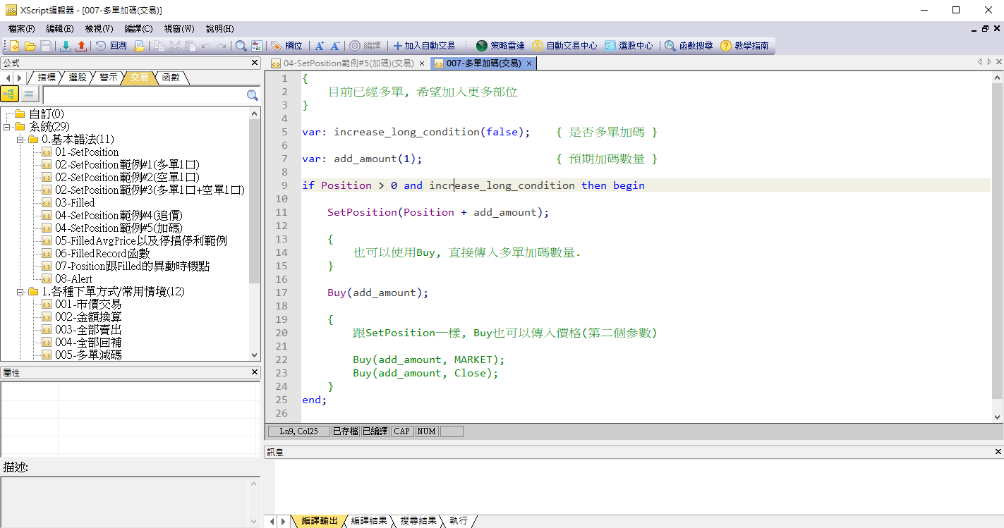 如果目前的Position是0的話,買進1張,委託價格使用策略預設的買賣價格。執行之後Position會變成1。   範例#2