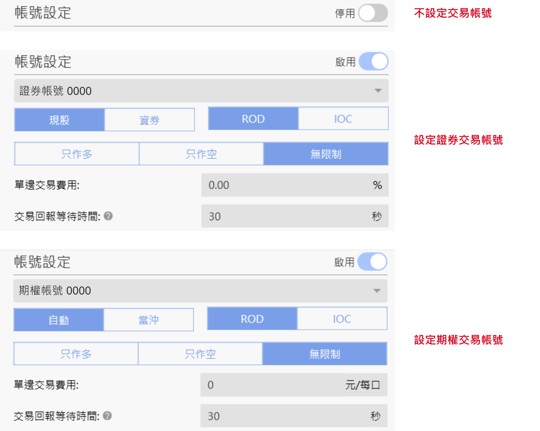 每一個交易策略可以指定這個策略執行時要對應的交易帳號,目前共提供三種設定的方式 分別是: