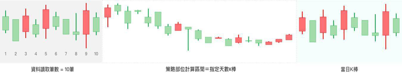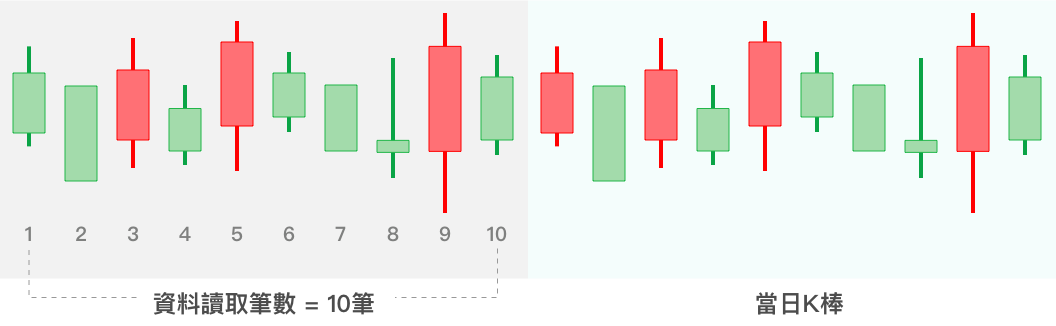 如同策略雷達的設定方式,使用者可以指定策略的資料讀取筆數。 策略啟動時,會依照資料讀取筆數讀取商品的歷史資料。 例如:資料讀取筆數設定是10的話,則會先讀取今日之前的10根K棒(不包含今日),K棒的頻率依照策略的設定。 讀取完成之後,系統會從第一根歷史K棒開始執行,每一根K棒執行一次,總共執行10根K棒,如下圖:     請注意:資料讀取區間內,如果腳本呼叫了任何交易指令,系統都不會予以執行,執行紀錄內會看到錯誤的提示。 由於這一個區間不會執行交易指令,所以如果腳本希望判斷這種情形的話,可以透過GetInfo函數,傳入”TradeMode”參數: