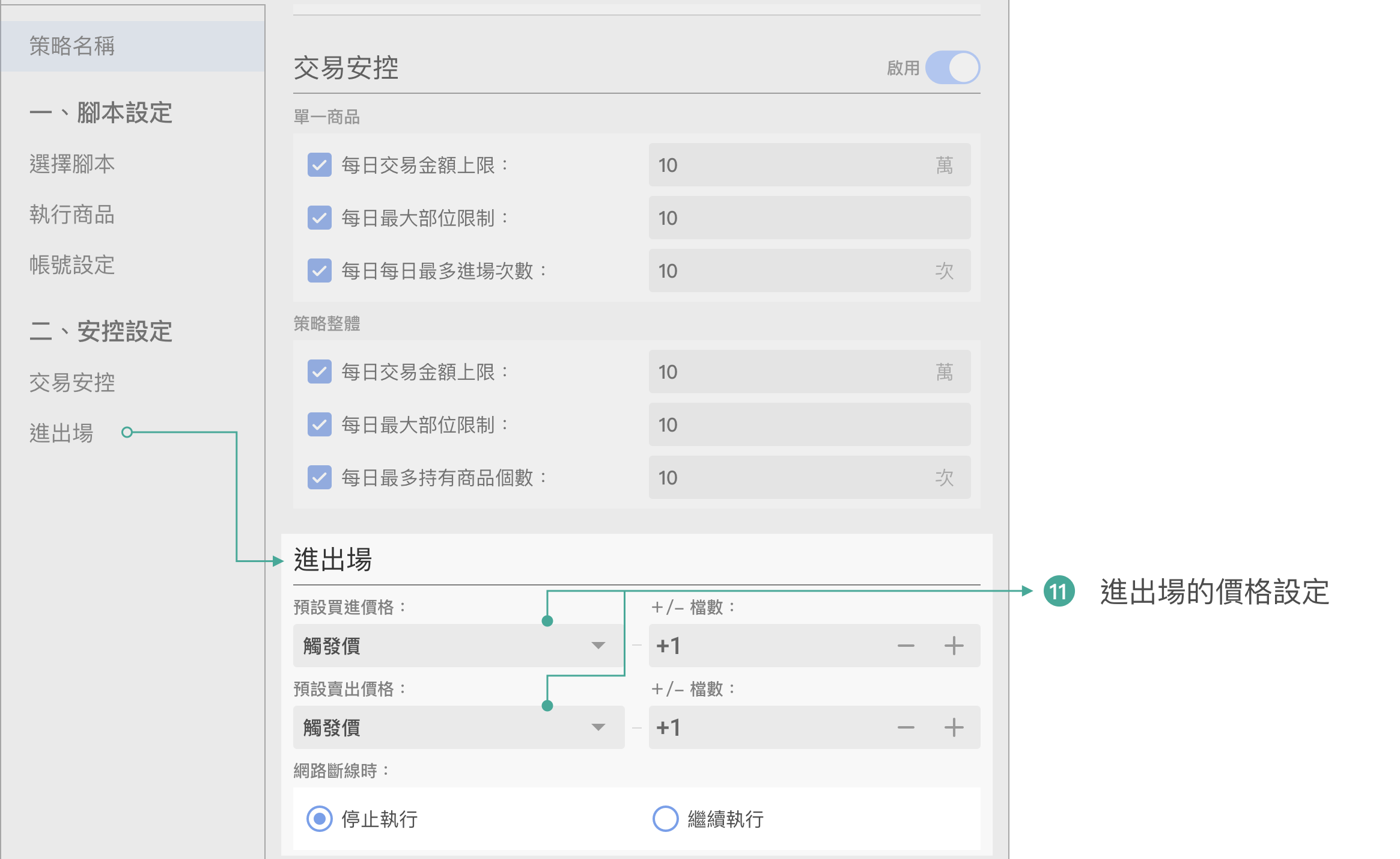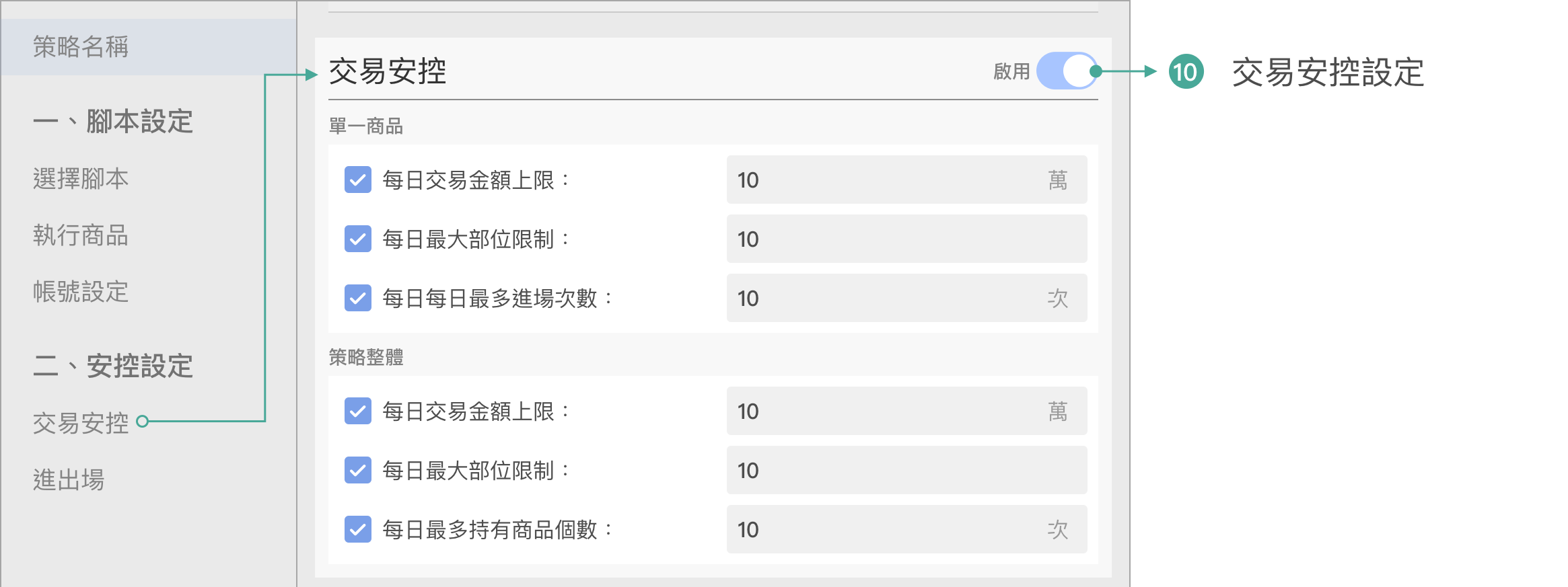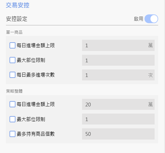 自動交易策略提供了以下的安控設定,使用者可以依照需求選擇需要開啟的項目: