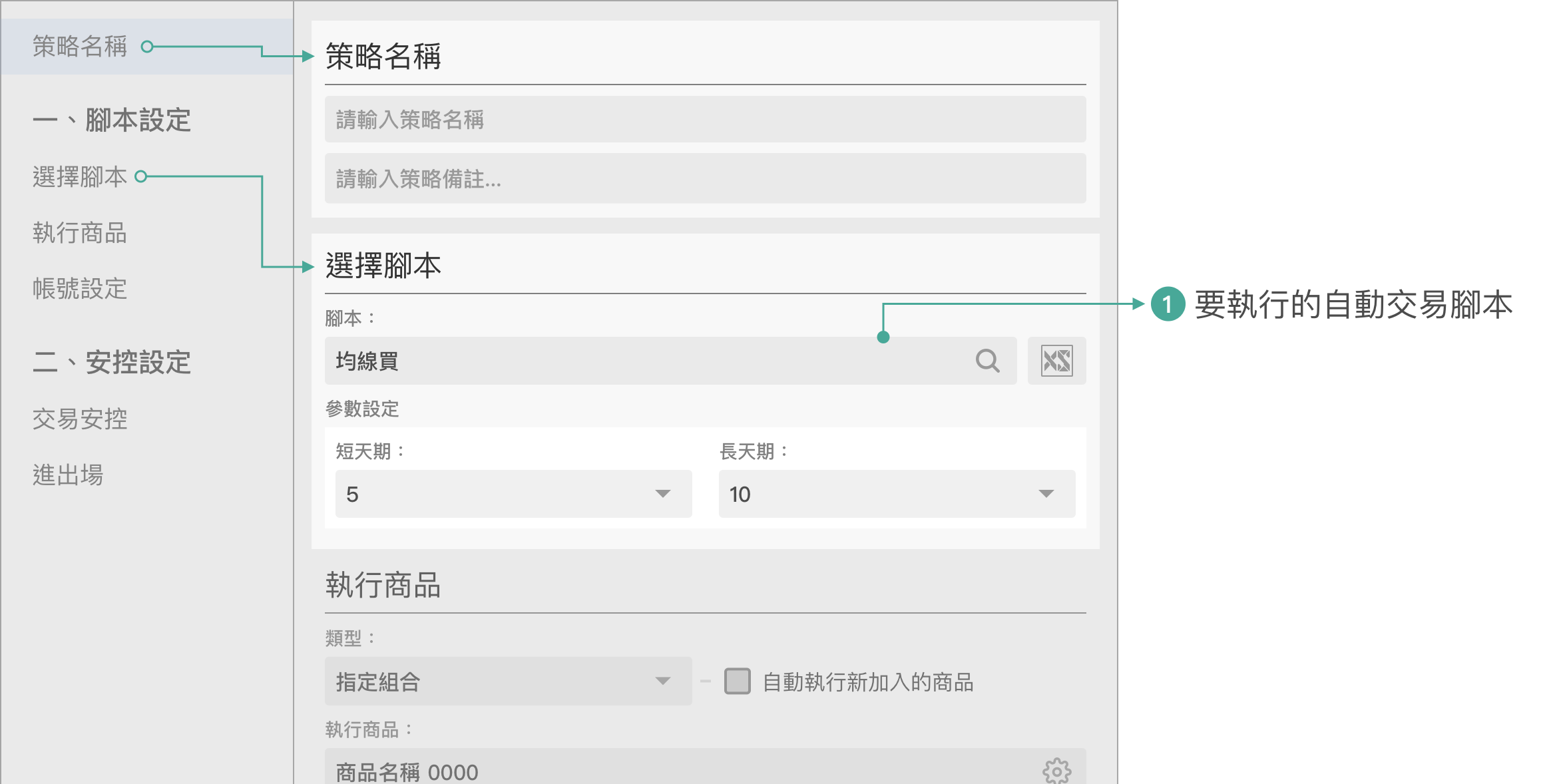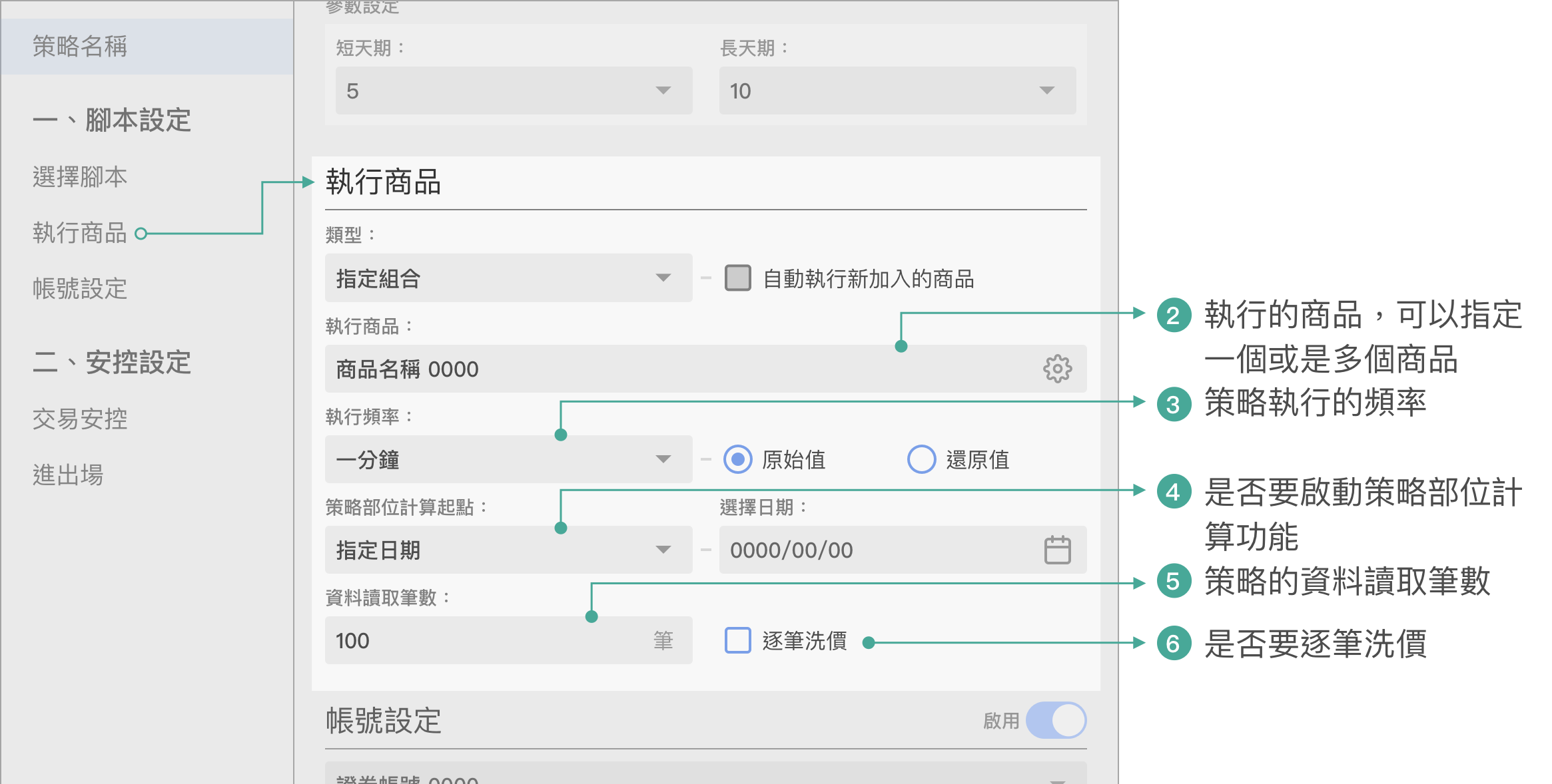 • 根據執行商品範圍,以及交易帳號選項,決定要執行哪些商品,