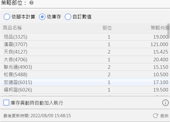 如果選擇「依庫存」策略在執行完歷史資料區間之後,系統會依照當時帳號的庫存,自動調整策略的部位,以及策略的未平倉成本。 在這種模式底下,使用者通常不會啟動策略部位計算功能,而是讓系統依照庫存的數值來設定部位。 如果使用者希望利用自動交易策略來進行庫存的調整動作的話,則可以使用這種模式。