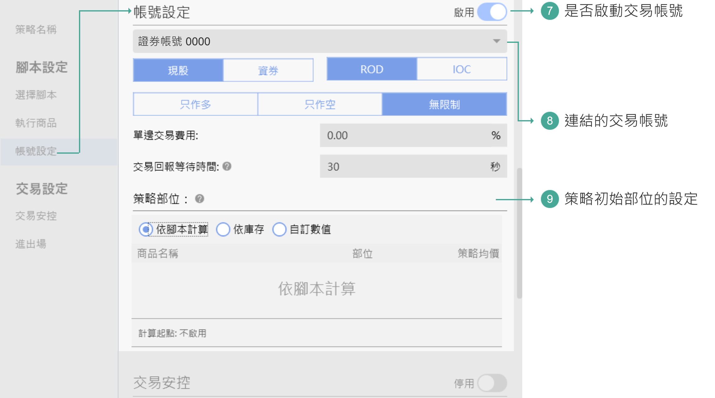 • (選項)依照交易帳號內的所指定的初始部位設定,調整策略的初始部位,