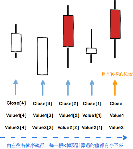 在這個腳本我們先計算短期的均線數字,把他存在Value1裡面,再計算長期的均線數字,把他存在Value2裡面,然後判斷Value1是否向上穿越(cross over)Value2,如果是的話則觸發。 從這段腳本內,我們只有看到Value1, Value2這兩個數字,他們代表的就是最新的短期均線跟長期均線的數值。可是,大家應該也知道,XS腳本在執行時是從左往右一根一根執行的,而這裡最重要的觀念是,在執行的過程內,每一根K棒執行時所計算過的數值,都是有存下來的。