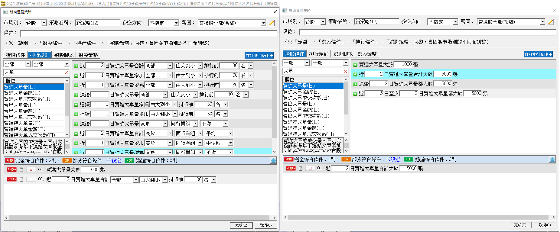 在7.02/3.02版時,我們推出了大單相關的欄位(包含買進大單量,賣出大單量等),當時這些欄位僅能在策略雷達/自動交易端使用。在這個版本內,XS選股也同步支援這些欄位。 在XS選股中心內,新增條件時可以直接找到這些欄位以及相關條件直接使用。 當然,你也可以從選股腳本內直接使用這些欄位。以下是一個腳本範例,用來篩選大戶買超的股票,大戶的定義是(買進特大單+買進大單)-(賣出特大單+賣出大單)> 0的股票。