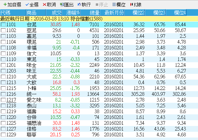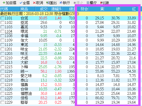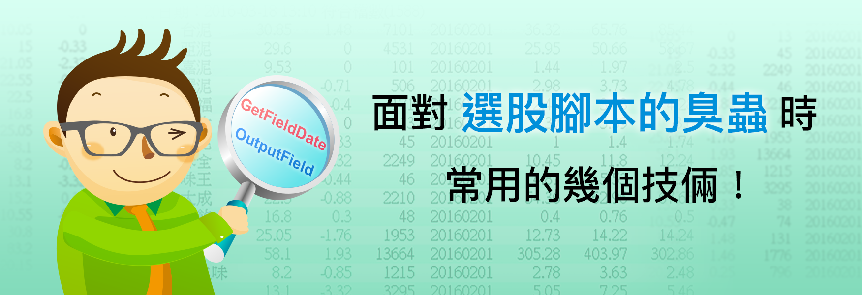 前一篇文章內我們談到了如何運用Print語法列印腳本的執行狀態,讓臭蟲無所遁形。由於目前選股腳本內還沒有辦法支援Print的語法,所以今天就來跟大家談一下小編在面對選股腳本的臭蟲時常用的幾個技倆。 首先要介紹的是OutputField這個語法。 OutputField這個語法的主要功能,就是讓使用者可以在選股的結果畫面內增加想要顯示的欄位,欄位的內容可以是任意的數值,或是字串。所以除了可以拿來顯示商品的資料欄位之外,當然也可以拿來檢查腳本的執行狀態。 比方說我想要找EMA多頭排列的股票,可是怎麼找出來的怪怪的呢?這時候OutputField就派上用場了: EMACode程式碼內第12行到第16行是小編為了確認執行結果時寫上去了。透過OutputField的語法,小編把這一檔商品是否符合(Condition1)以及均線的數值(Value1, Value2, Value3)都列印出來。特別注意到第12行的ret=1。這一行等於是把所有的股票都選出來了,這樣子的話才好檢查資料是不是正確啊。 底下是跑出來的結果: EMATable有沒有看到紫色框線內的這四個欄位!這時候我們就可以利用排序的方式,甚至把結果匯出到Excel,然後再來做更深入的檢視。 除了腳本邏輯的問題之外,在設計選股方式時,小編也常常遇到需要計算財報/籌碼等欄位資料的需求。由於這些資料的公佈時間不一,而且單位也比較複雜(有的是億,有的是百萬,有的是百分比),所以在確認腳本的執行邏輯前,小編通常也會利用OutputField把欄位印出來先看過一遍,再來決定腳本怎麼寫比較對。 例如說我想要估算最新一季的季營收時該怎麼寫?先把資料印出來再說: