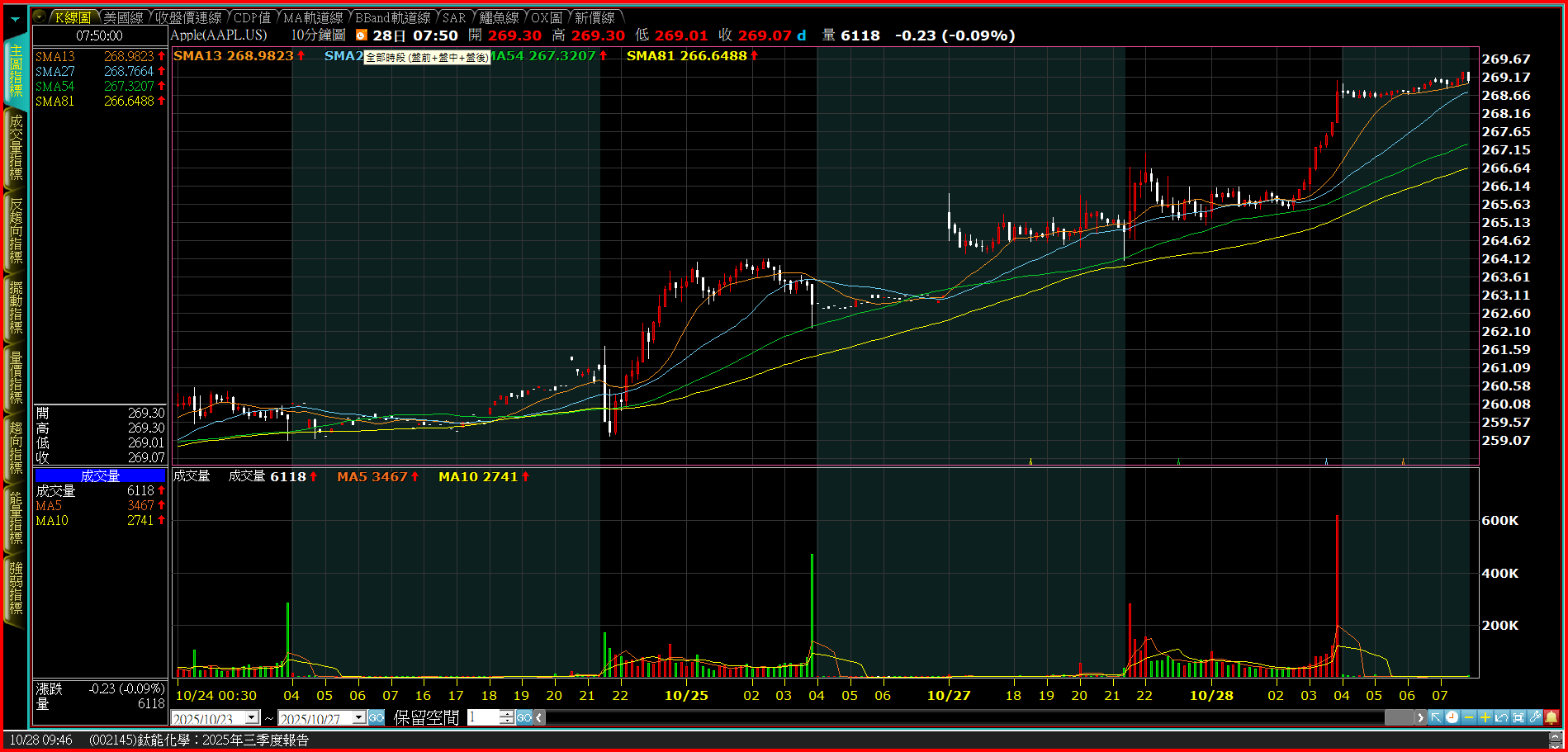 • 技術線圖: 使用者可以點選線圖上方頻率旁的 時鐘圖示 選項,來切換「正常交易區段」以及「包含盤前盤後的交易區段」。