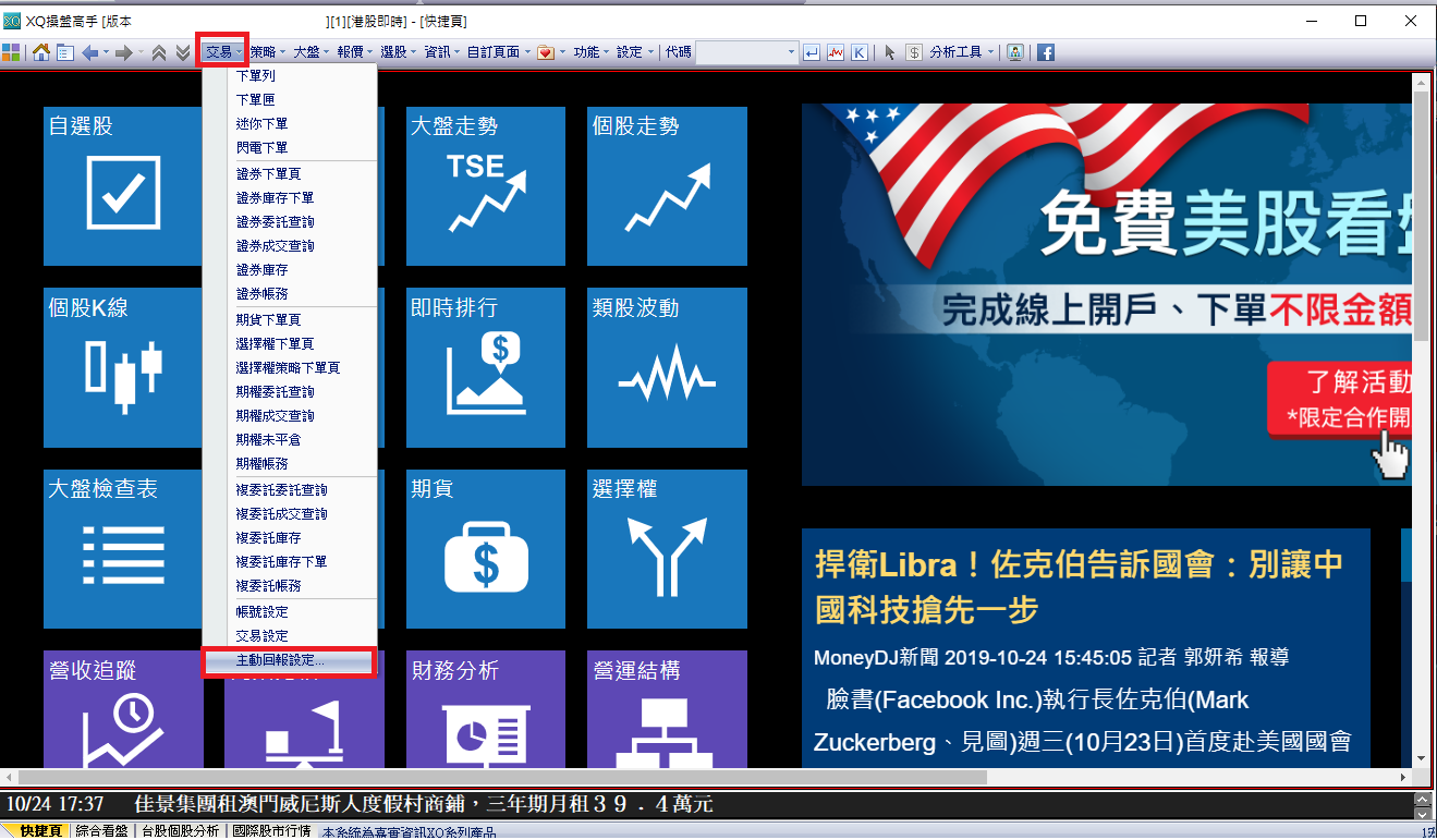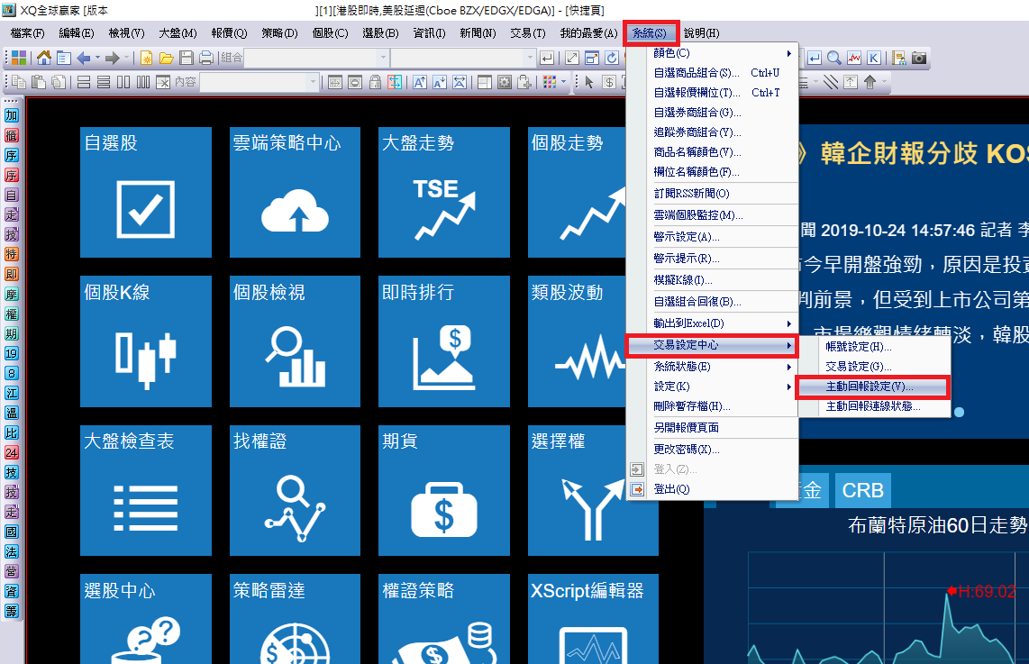 在登入您的XQ(企業版)後,請點選系統->交易設定中心->交易回報設定。 <<XQ(個人版)請點選交易->主動回報設定>>
