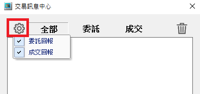 以下圖片就是交易訊息中心的顯示畫面啦,只要您進行委託等操作,就會顯示出您的時間、委託操作、證券商、帳號、委託序號、購買商品以及張數。 如果您只想看委託紀錄或是成交紀錄的話,可以點選「委託」、「成交」頁簽,也可以點選"齒輪"進行設定。