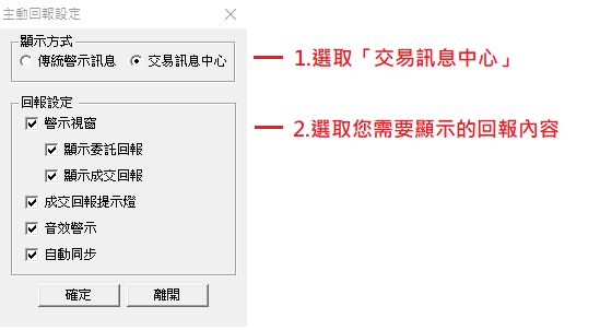 進入主動回報設定畫面,即可看見選擇顯示方式,有原本的傳統警示訊息功能,與新推出的"交易訊息中心"功能,可以依照您的喜好進行調整。 設定完之後點選"確定",就可以體驗交易訊息中心啦。