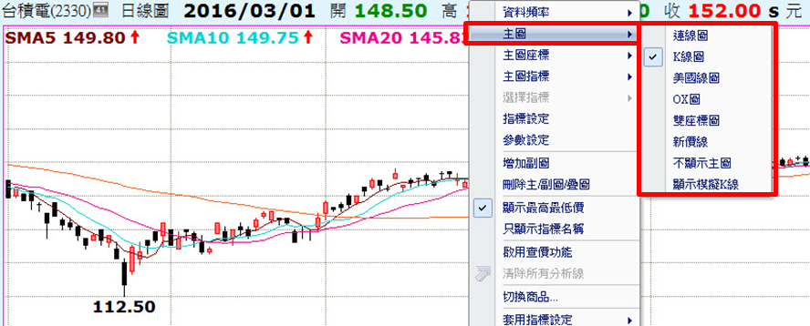 主圖也可以切換為其他指標,我們直接在畫面上點按滑鼠右鍵,選擇「主圖」,預設為K線圖,可以切換為其他主圖類型,例如連線圖、K線圖(預設)、美國線圖、OX圖、雙座標圖、新價線、不顯示主圖、顯示模擬K線..等。