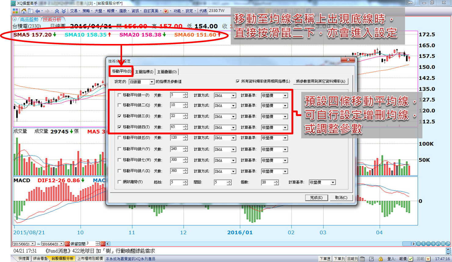 在主圖上預設為四條移動平均線,但如果現有的均線參數,都不是您想要的呢? 我們可以點選滑鼠右鍵,進入[指標設定],在第一個"移動平均"頁籤可以勾選要顯示幾條均線,以及可以自行修改均線周期,例如我們只留兩條均線,把參數改為22和65,按下完成;這時候圖上的均線,就是我們要的均線囉! 您也可以在主圖的左上方,雙擊這個指標的名稱,可以快速進入參數設定的畫面喔!
