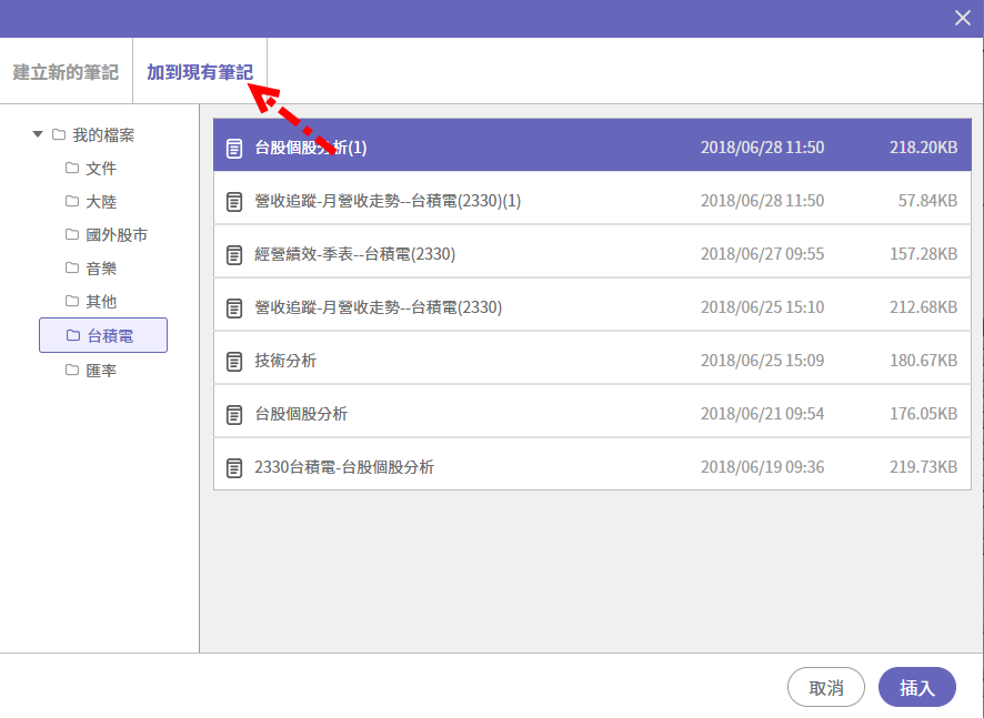 同一篇文章,可以結合不同的圖表或文章,在儲存時,選擇"加到現有筆記",即可本次要加的內容,加到已存筆記的文章下方。