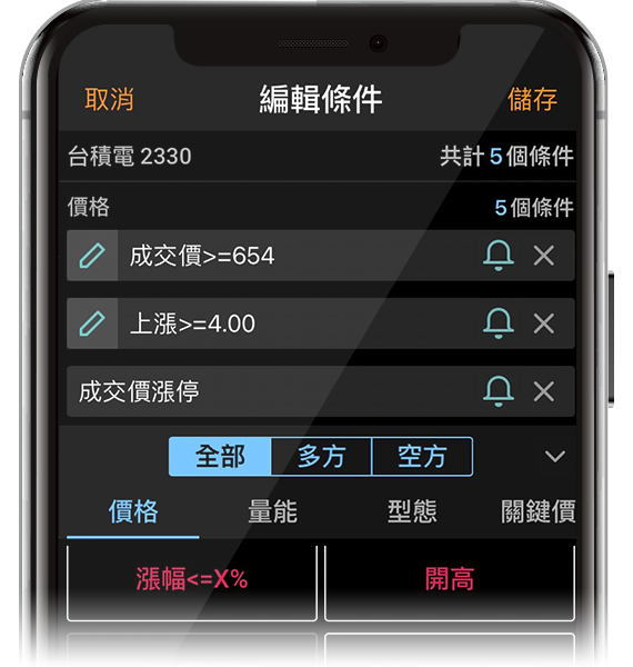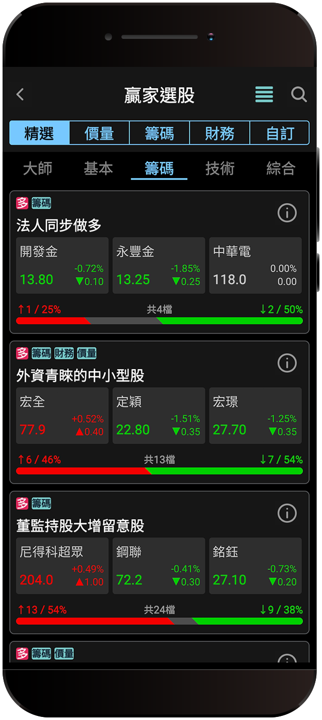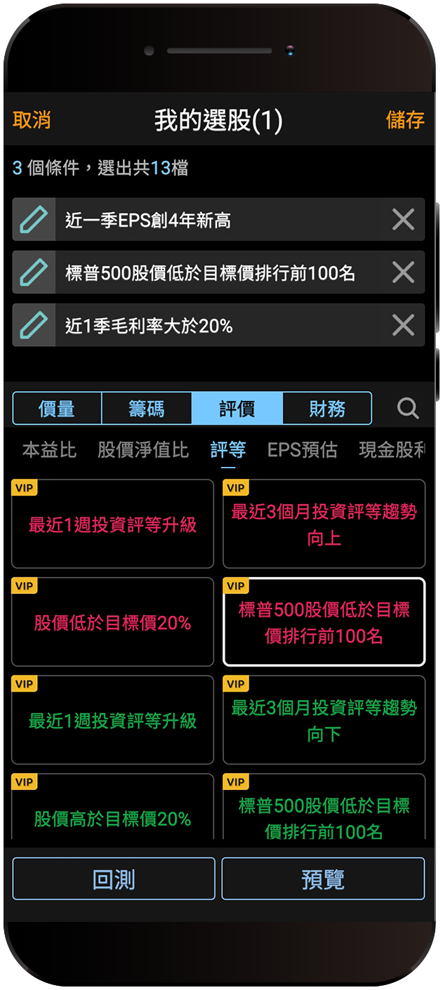 多種價量、籌碼、評等、財務等選股條件,精準找到理想股。(進階付費功能)