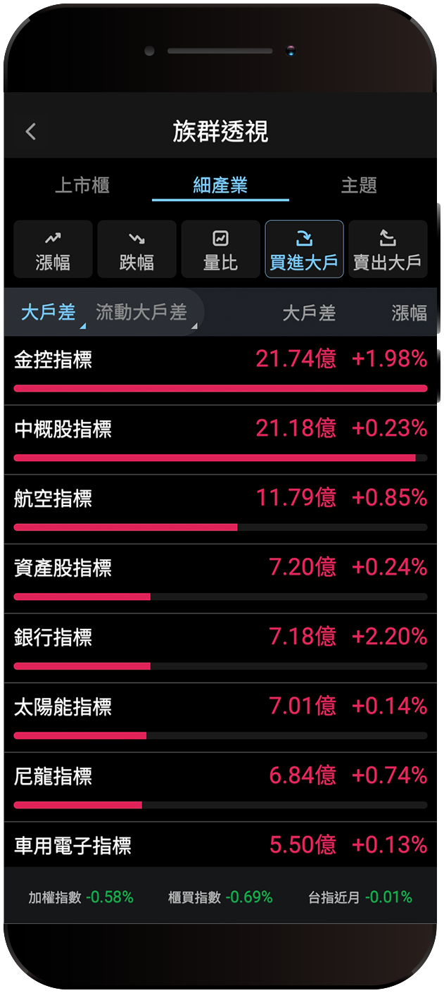 透過細產業及熱門主題指標,搭配獨家大戶欄位,找出當日強/弱勢類股。(進階付費功能)