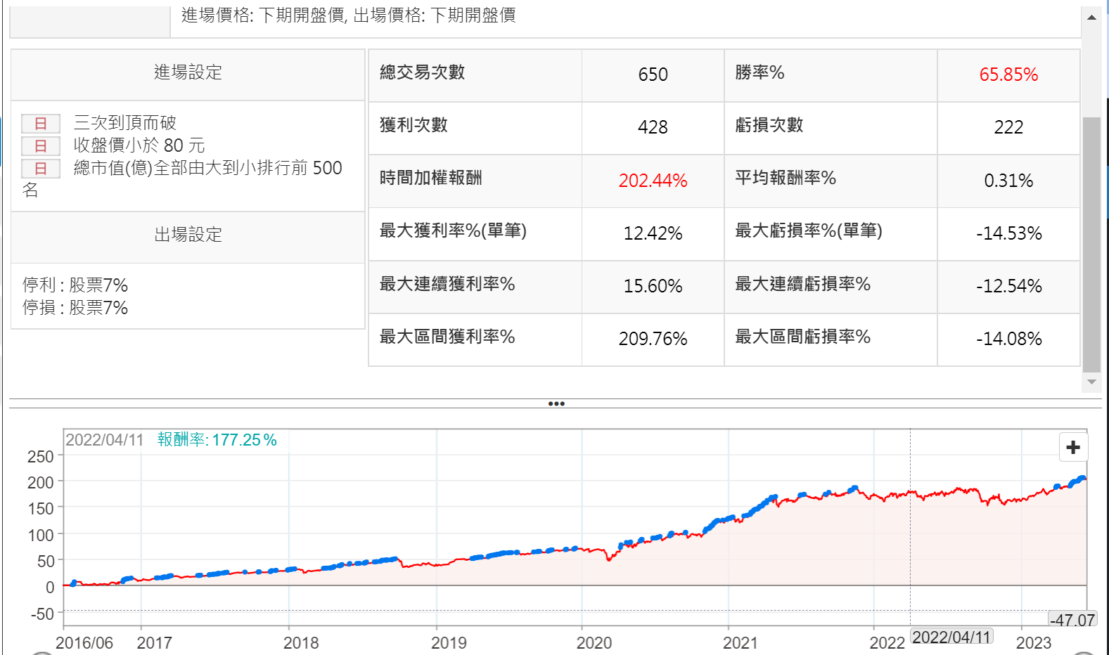 把這個策略拿去回測過去七年,停損停利都設為7%,回測報告如下圖