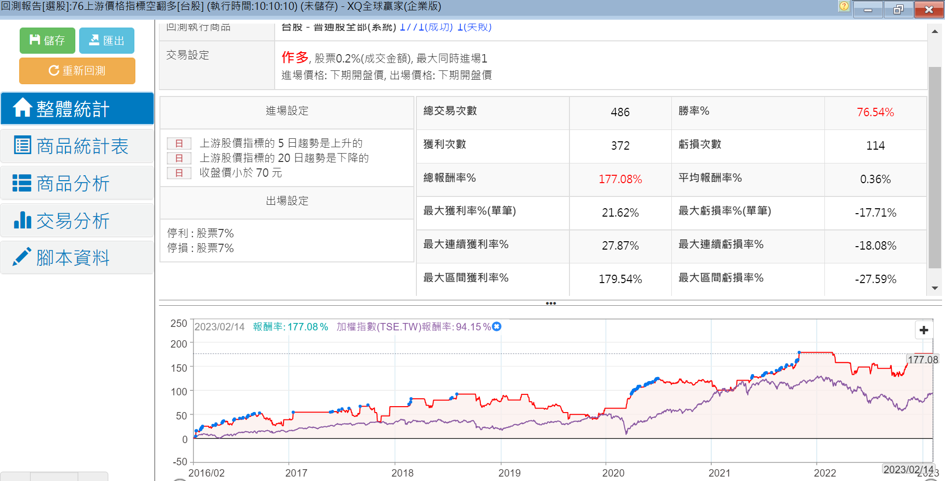 我用這個策略去回測過去七年,停損停利都設7%,回測報告如下圖: