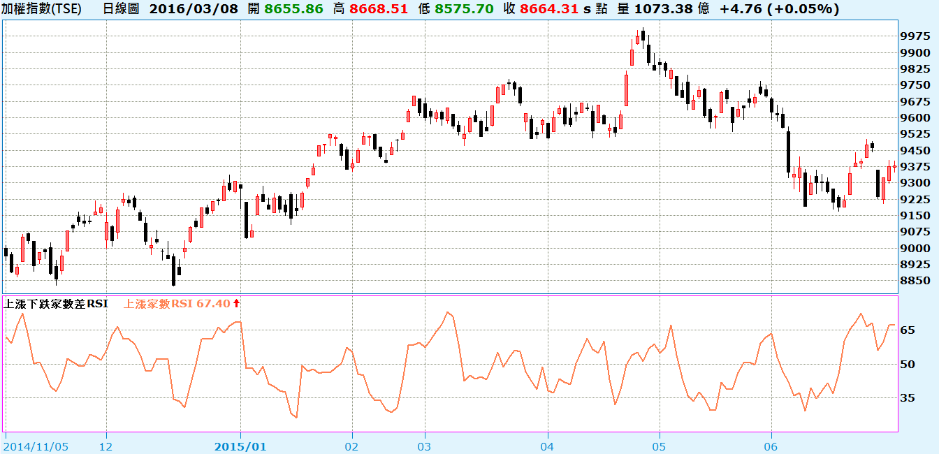 所以在計算上漲下跌家數差RSI時,這個數字會隨著每天上漲家數-下跌家數的變化,而在0-100之間波動,當數字在上昇,代表近十日的上漲下跌家數差,比前一天增加,至於增加的速度與幅度,就看這十天之內上漲下跌家數的變化程度。