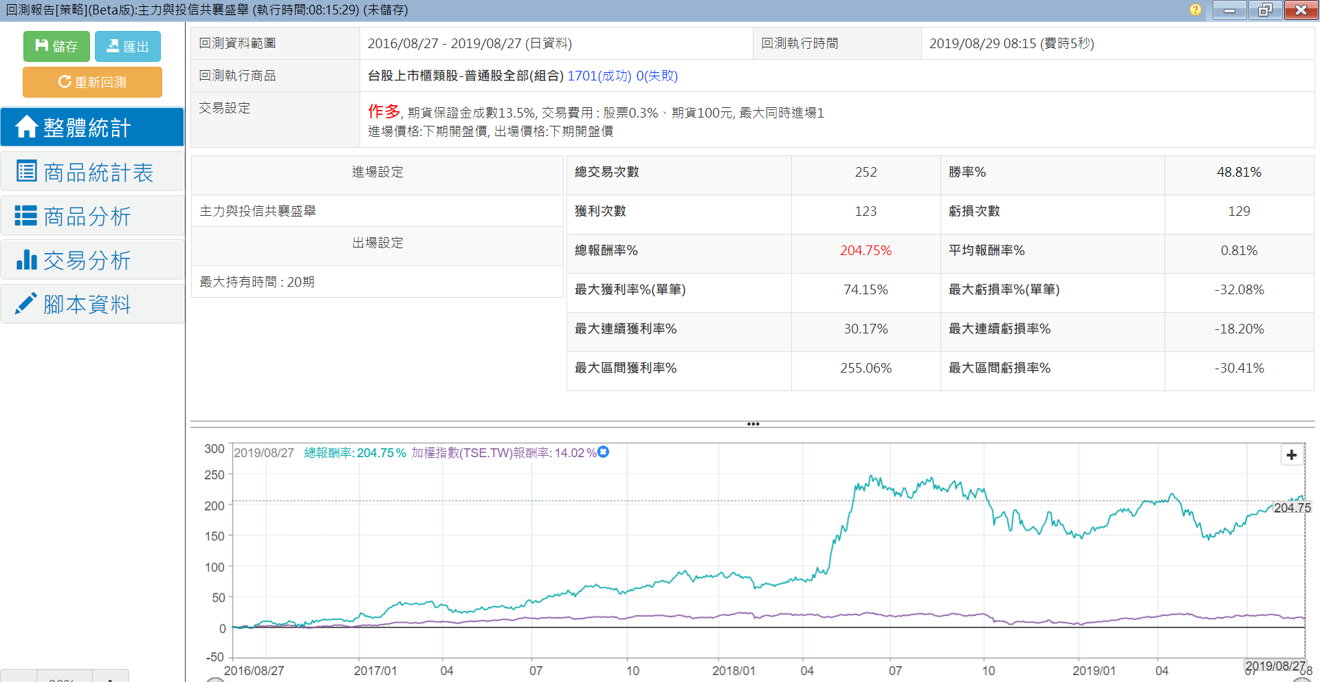 雖然勝率不到50%,但三年有252個交易機會,平均一年有超過80次,報酬率達到204%,遠遠打敗大盤的14%,網友有特別交代,這個策略在多頭市場表現會非常好