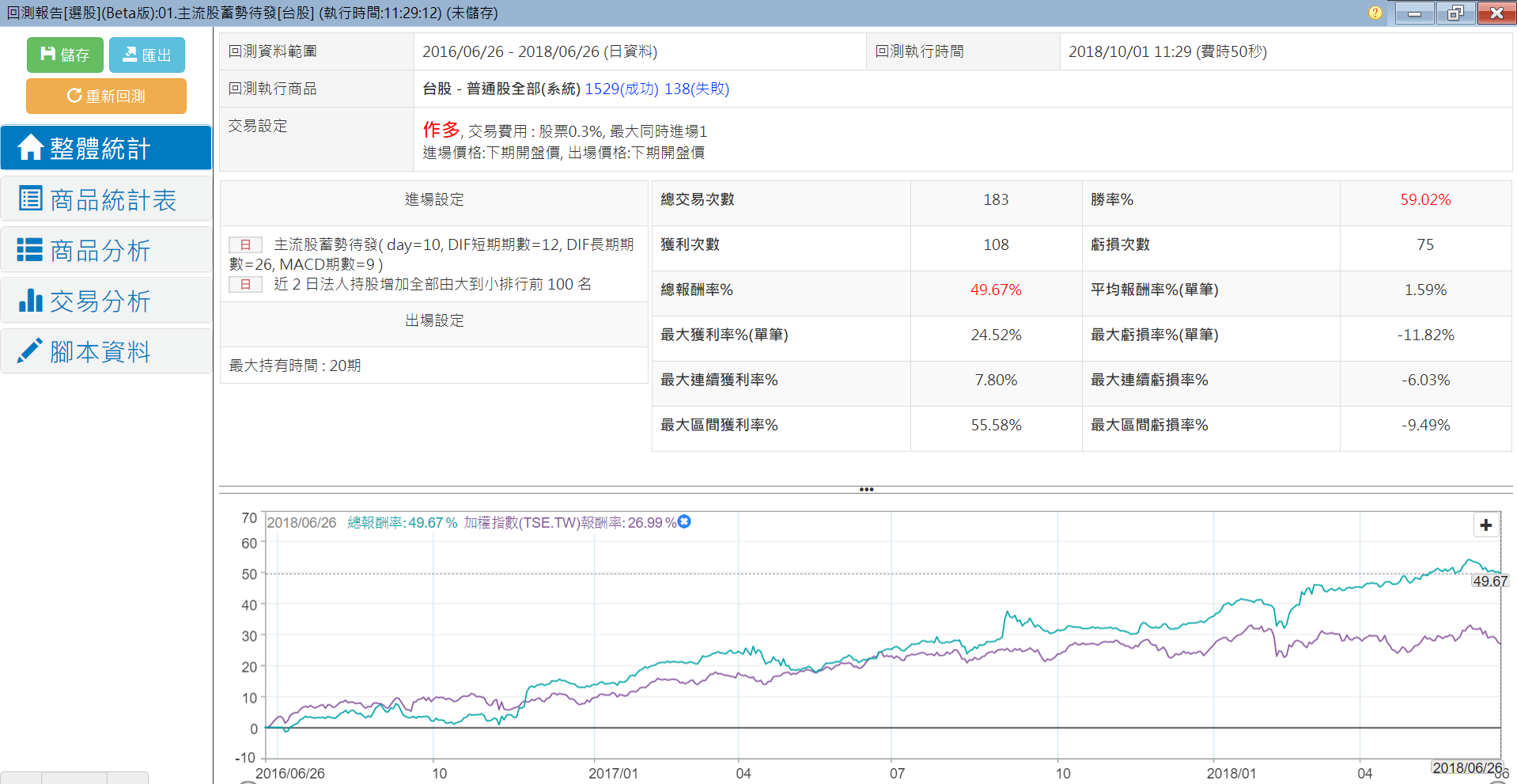 我們一般都認定法人如果買超的股票算是主流股。 如果主流股離均線不遠且創近期新高,且上漲趨勢已成,那是不是後市看漲的機率會大一點? 基於這樣的想法,我寫了一個主流股蓄勢待發的選股策略。回測這個策略,發現這是屬於那種可以穩定維持一定獲利且淨值下跌風險還算OK的策略。
