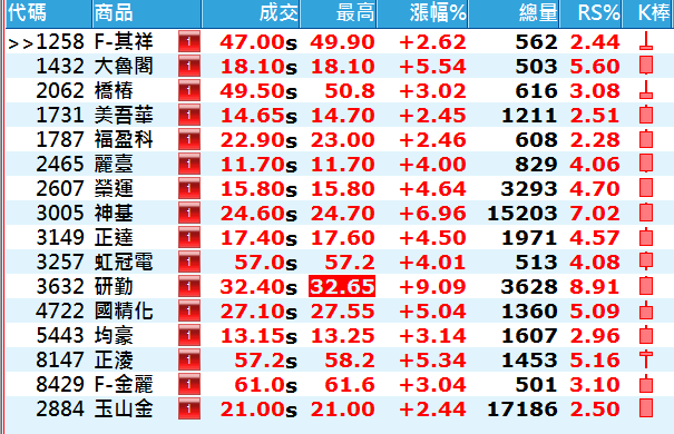 雖然指數昨天是開高走低,但上述這些價量齊揚的股票,不少是收在當天最高點附近。