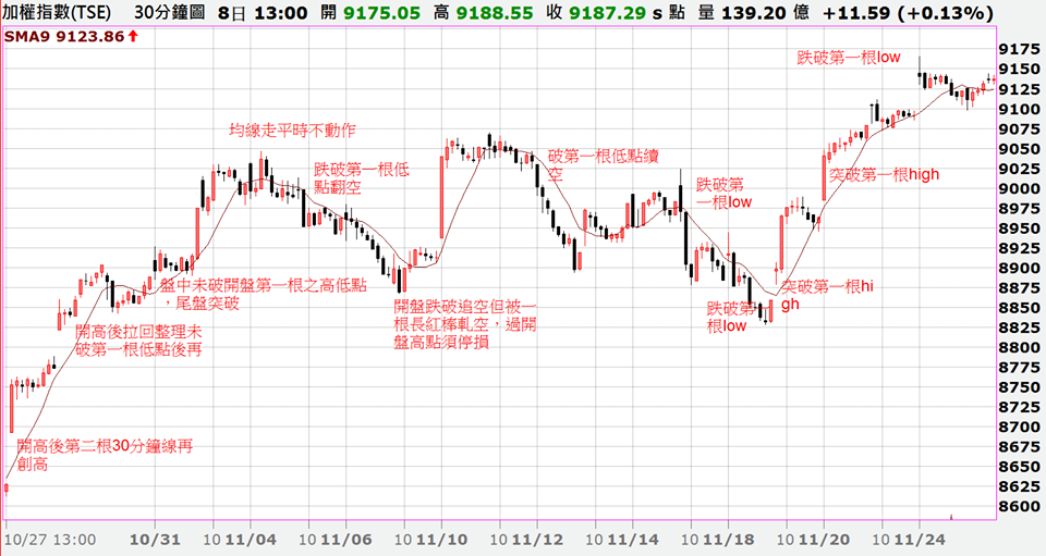 4.九點三十分之後,當指數突破這根bar的高點,且MA9斜率為正,就作多期指,跌破這根bar的低點且MA9斜率為負就作空期指。