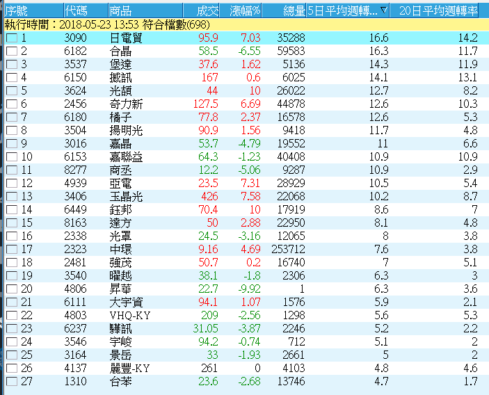 網友希望可以訂出一個選股條件,這個條件是個股的近五日平均週轉率要高於二十日平均週轉率。