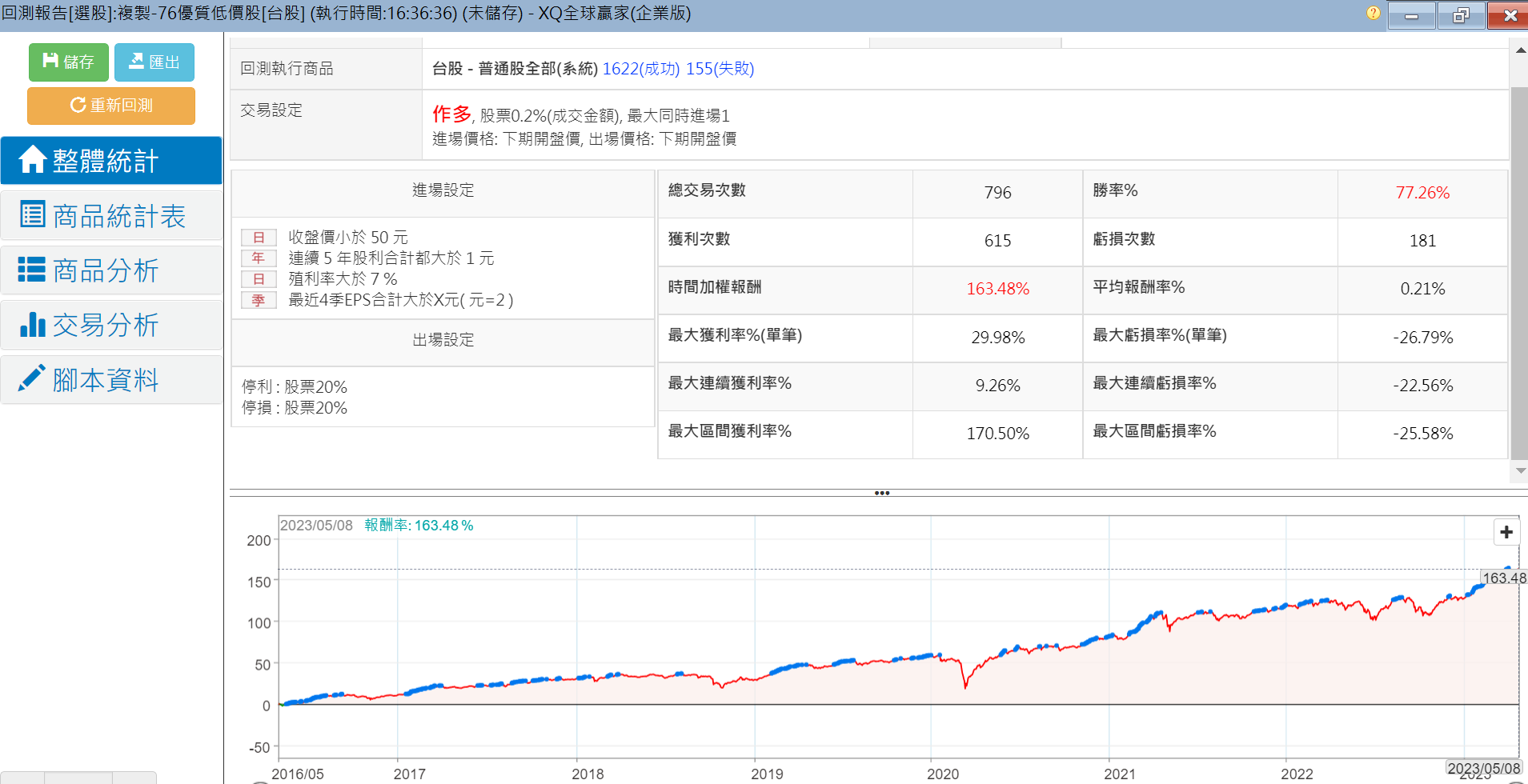 這個策略就可以很明顯的呈現出勝率還在七成之上,但總報酬率好非常多,且MDD降到勉強可以接受的地步了。