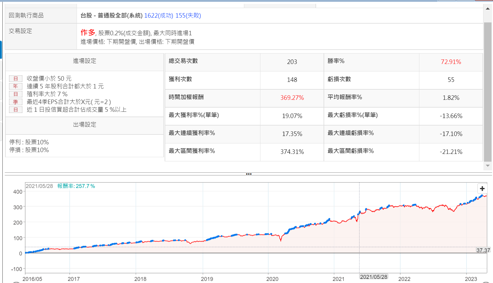 這次研究在價值型投資策略加上進場條件時,我把這個策略拿出來,加上近一日投信買超佔成交量5%以上的進場條件,改成波段持有,停損停利設為10%,回測報告如下圖: