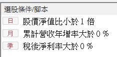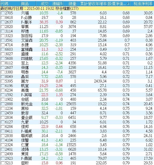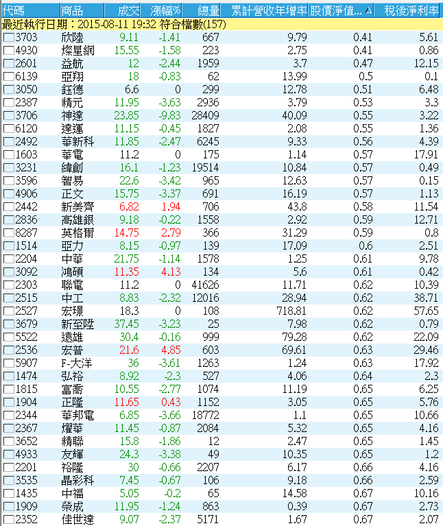 這樣挑出來的股票,可以把他們按股價淨值比,由最低開始排,如下圖