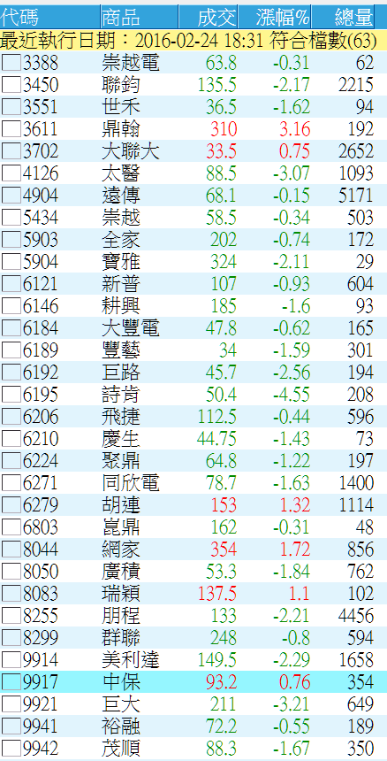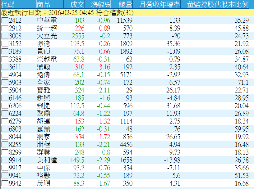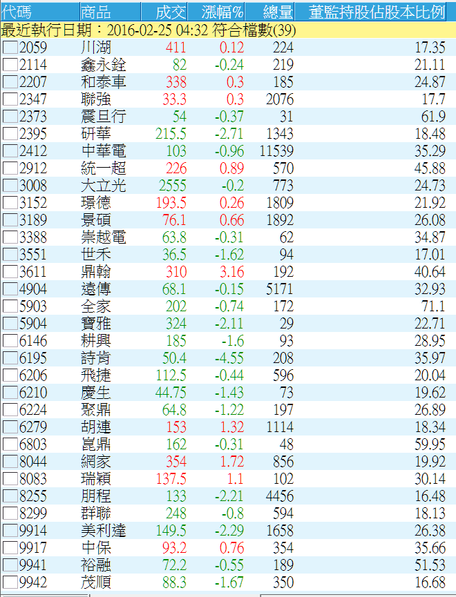 接下來我再設了一個濾網: 董監事持股比例超過15%。加了這個條件之後,符合的股票再被濾掉 23檔,剩39檔,名單如下: